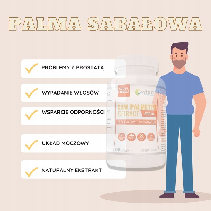 Висококонцентрований препарат, що містить екстракт пальметто, рослини, яка позитивно впливає на проблеми простати, позитивно впливає на проблему волосся втратаособливо у чоловіків. Це багате джерело жирних кислот і філостеролів, які допомагаютьзнизити рівень холестерину в крові.
