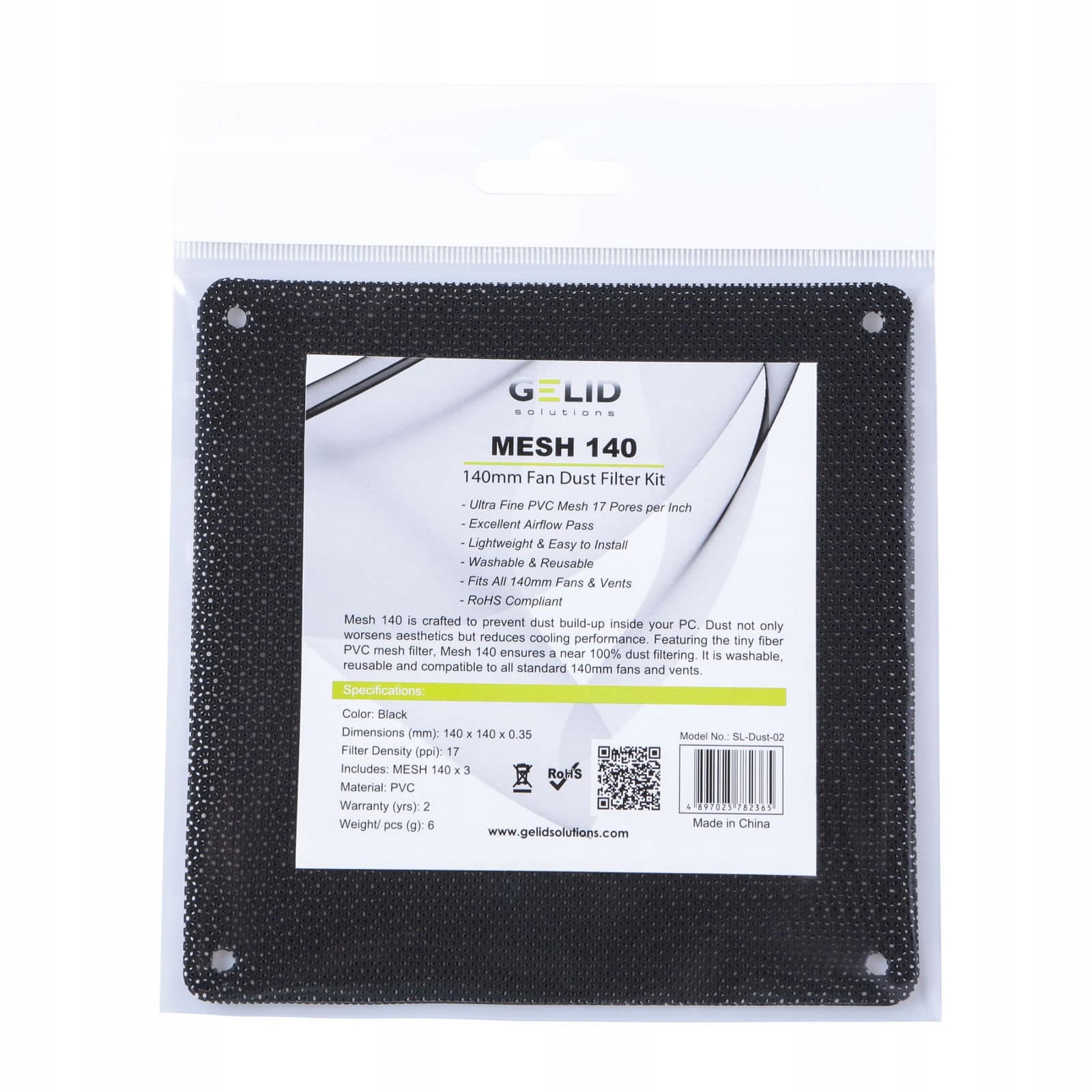 Gelid MESH 140 (SL-Dust-02) — це набір пилових фільтрів діаметром 140 мм для вентилятора. Сітка 140 створена для запобігання накопиченню пилу всередині комп'ютера. Пил не тільки погіршує естетику, але й знижує ефективність охолодження, а також може накопичувати певну кількість електричної ємності та провідності, що впливає на надійність і термін служби комп’ютера.