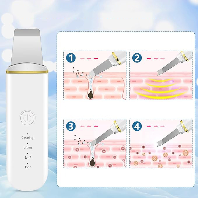 🌟3. Безпечний і простий у використанні:Ультразвукова чистка обличчя дуже проста і безпечна навіть для людей, які ніколи раніше не користувалися таким обладнанням. Цей компактний і портативний пристрій пропонує чотири функції, які можна легко змінити одним натисканням кнопки. Це чудовий засіб для видалення чорних крапок, очищає пори та засіб для догляду за шкірою.
