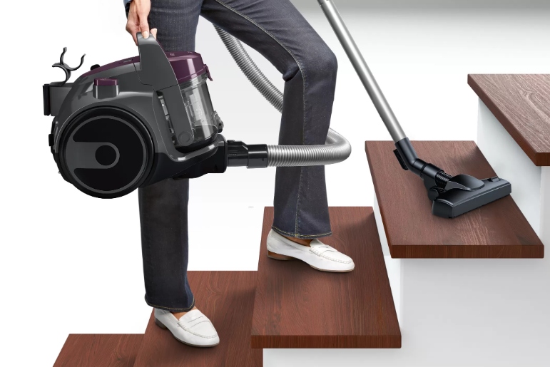 Пилосос без мішка, компактний розмір, новий інноваційний високошвидкісний двигун HiSpin, змінна роликова щітка, автоматичне змотування кабелю, робочий діапазон 9 м, рівень звуку 78 дБ(A).