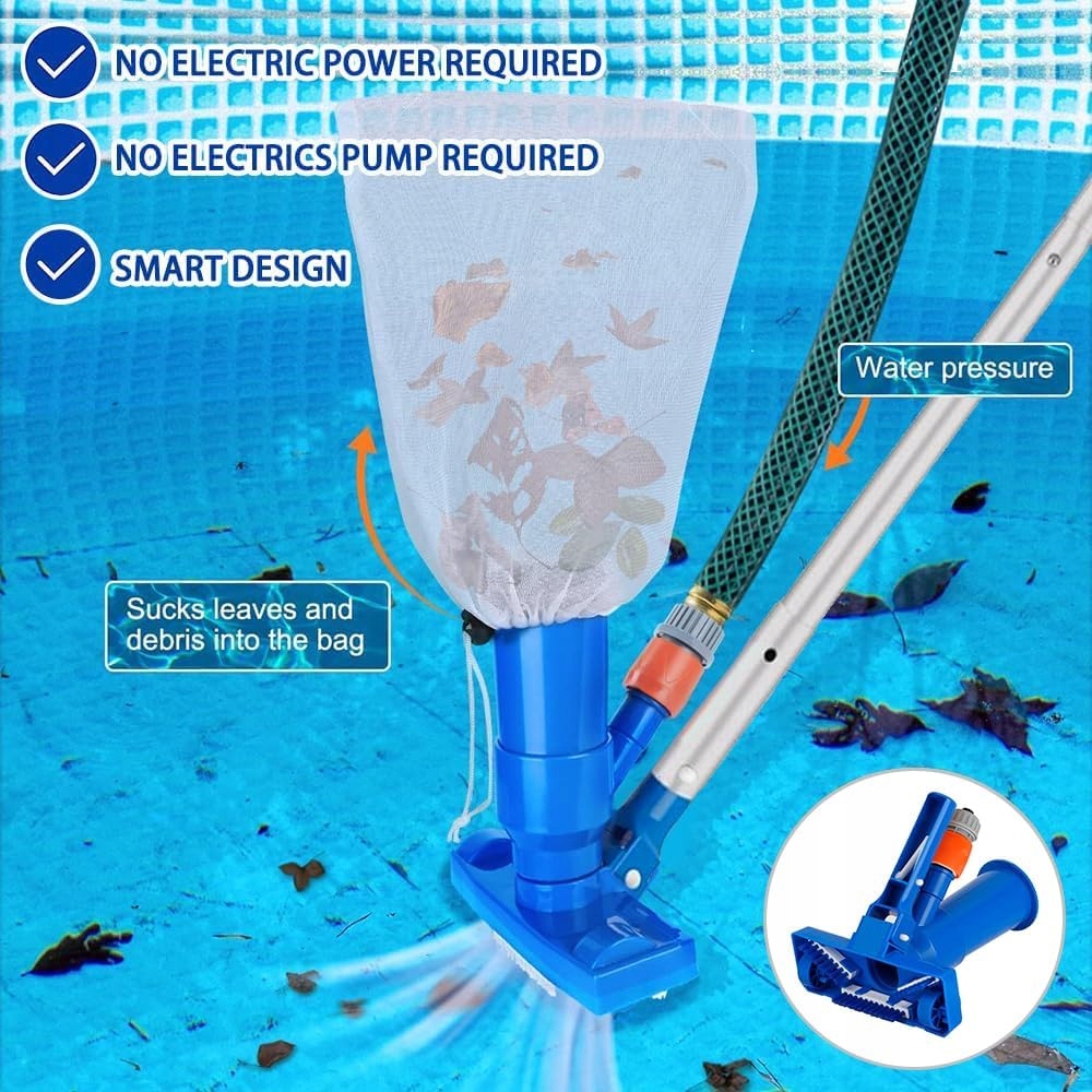 - Простий у використанні: пилосос для басейну не потрібно підключати до стандартного садового шланга, і він працює. Вода в трубці надходить у вакуумний вхід і створює ефект всмоктування, потім бруд, листя або пісок всмоктуються безпосередньо в сітчастий мішок. Потужність всмоктування залежить від тиску води та довжини садового шланга.
