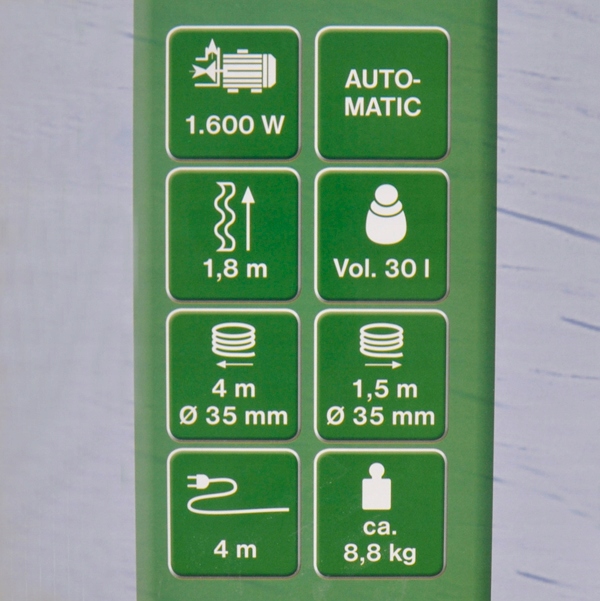 - Пилосос з номінальною потужністю 1600 W і максимальна висота всмоктування 1,8 м. Має вбудовану функцію розпізнавання рівня наповнення резервуара, а також автоматичне спорожнення при наповненні