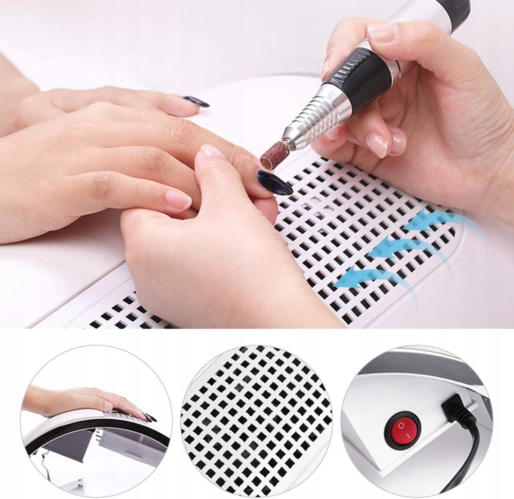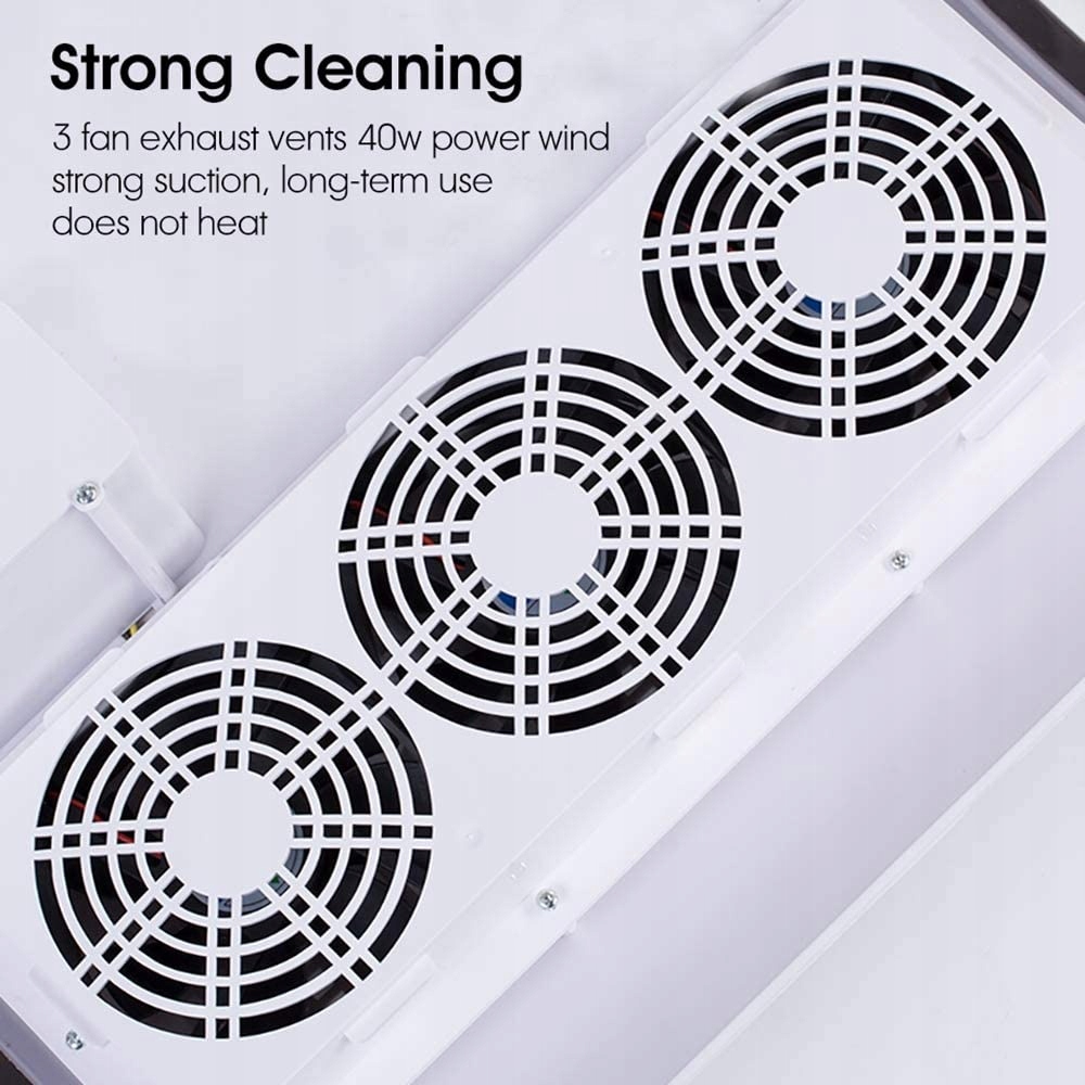 3 потужні вентилятори Потужний пилозбірник для нігтів оснащено 3 потужними вентиляторами для збору пилу, який утворюється під час підпилювання або полірування нігтів. 40000 CFM Зберігає навколишнє середовище чистим і охайним, тому вам більше не доведеться турбуватися про пил, що витає навколо. Низький рівень шуму Пилосос для нігтів має тихий двигун, який забезпечує тиху та розслаблюючу атмосферу, збираючи пил. Практична функція: цей пилозбірник манікюрного салону є найкращим інструментом для збирання пилу під час підпилювання або полірування нігтів. Необхідні в манікюрному салоні, щоб клієнти могли насолоджуватися кращою якістю обслуговування. Створіть більш професійну та ексклюзивну атмосферу у своєму манікюрному салоні. Підійде і для тих, хто любить робити своїми руками вдома. Дизайн підставки для рук 100 нових високоякісних матових підставок для рук, зручний і міцний. Зручно як для клієнтів, так і для технічних працівників. Підходить для манікюрних салонів, шкіл нейл-арту, особистого користування, оптової торгівлі тощо. 2 мішки для пилу Цей засіб для чищення нігтів оснащено 2 мішками для пилу, які можна легко встановити на вихід вентилятора, а також замінити та помити.