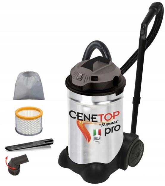 Пилосос для золи Ribimex, серії CeneTop pro, має потужність 1200 Вт і ємність 30 літрів. У комплект пилососа входить гнучка труба, телескопічна труба, обертовий наконечник із синтетичною щетиною та довгий щілинний наконечник.