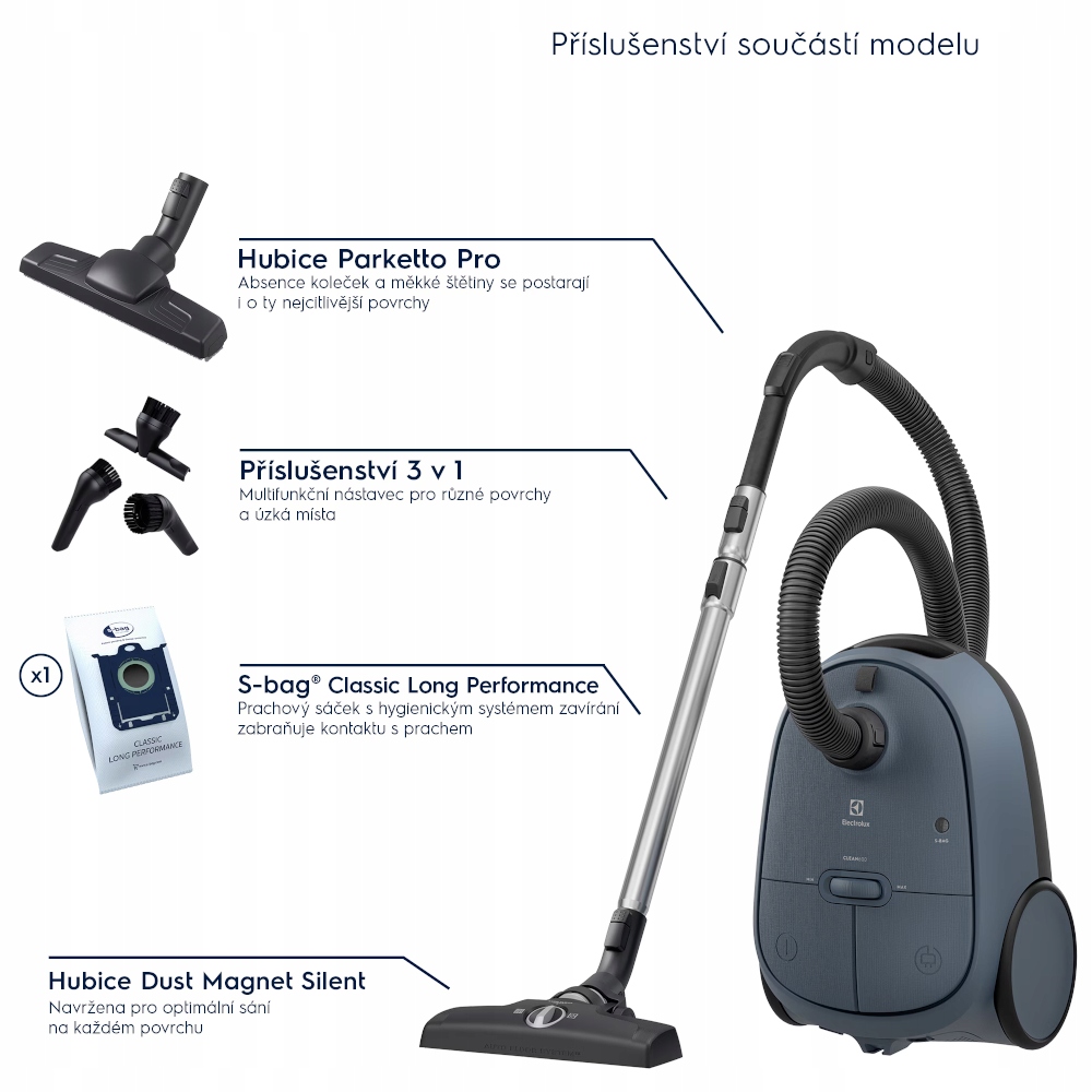 Наконечник 3 в 1 для очищення вузьких місць, оббивки та пилу Parketto Pro – ніжна насадка для всіх твердих підлог Виготовлений на 50% з переробленого пластику Автоматичне розпізнавання поверхні та регулювання всмоктування Ефективна багаторівнева фільтрація з HEPA 12 Зручне керування живленням, кабелем і перемикачем ногою Телескопічна металева трубка, яку зручно носити 12-метровий робочий діапазон без повторного підключення кабелю Висока потужність всмоктування для видимих результатів на будь-якій підлозі Легка та гігієнічна заміна S-bag 3,5 л Компактне зберігання у вертикальному та горизонтальному положеннях Властивості