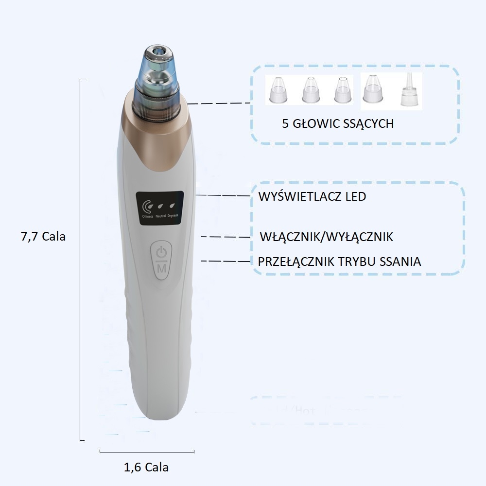 Пилосос, призначений для всіх типів шкіри. Це безболісно і сучасно. Має 5 змінних наконечників і 3-ступеневе регулювання потужності.
