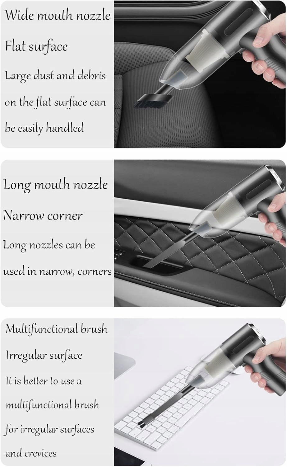 1000. 0 річних Потужний міні-пилосос із всмоктуванням працює на основі циклонної вакуумної технології. У цьому бездротовому ручному пилососі використовується надпотужний двигун із потужним всмоктуванням. Це дозволяє досягти найшвидшого та глибокого очищення, легко видалити котячий туалет, пил домашніх тварин, сміття та інші неприємні залишки. Універсальний насадний інструмент Crevice для видалення бруду у вузьких кутах і місцях Інструмент-щітка для підняття шерсті домашніх тварин на дивані чи килимку. Ідеальний автомобільний партнер і вибір подарунка, як якісно виготовлений ручний пилосос. Ергономічний дизайн і низький рівень шуму. Ергономічна текстурована ручка складного портативного пилососа забезпечує зручне захоплення, щоб ви не втомилися і тримали його протягом тривалого часу. який майже такого ж розміру, як фен. Тож цей ручний бездротовий пилосос можна розмістити будь-де, щоб задовольнити ваші щоденні потреби в прибиранні. Міцний фільтр, який миється. Високоякісний фільтр у пилососі можна мити в проточній воді. Коли вакуумний фільтр забитий, просто вийміть і очистіть фільтр. Перш ніж увімкнути пилосос, переконайтеся, що фільтр сухий і правильно встановлений. Цей бездротовий прибиральник дозволяє вільно пересуватися з кімнати в кімнату без громіздких і заплутаних ниток. Він легкий і ергономічного дизайну з ремінцем для ручки в нижній частині корпусу, який дозволяє легко ковзати під час чищення підлоги та зони відпочинку. Чудово підходить для домашньої кухні для домашніх тварин.