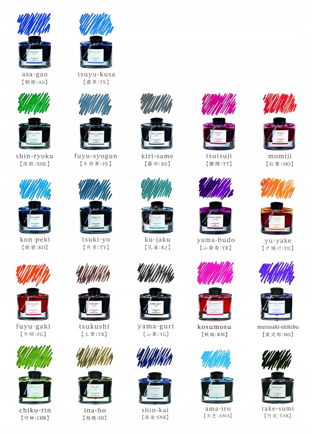 Назва «іросідзуку» є поєднанням японських слів «іро» (колір), що вказує на високі стандарти та колірні варіації, і «сідзуку» (крапля), що відображає зображення капаючої води. Назва кожного чорнила походить від назв красивих японських природних ландшафтів і рослин. Кожен з них виражає глибину відтінків. Насолоджуйтесь насиченими кольорами та естетикою під час написання.