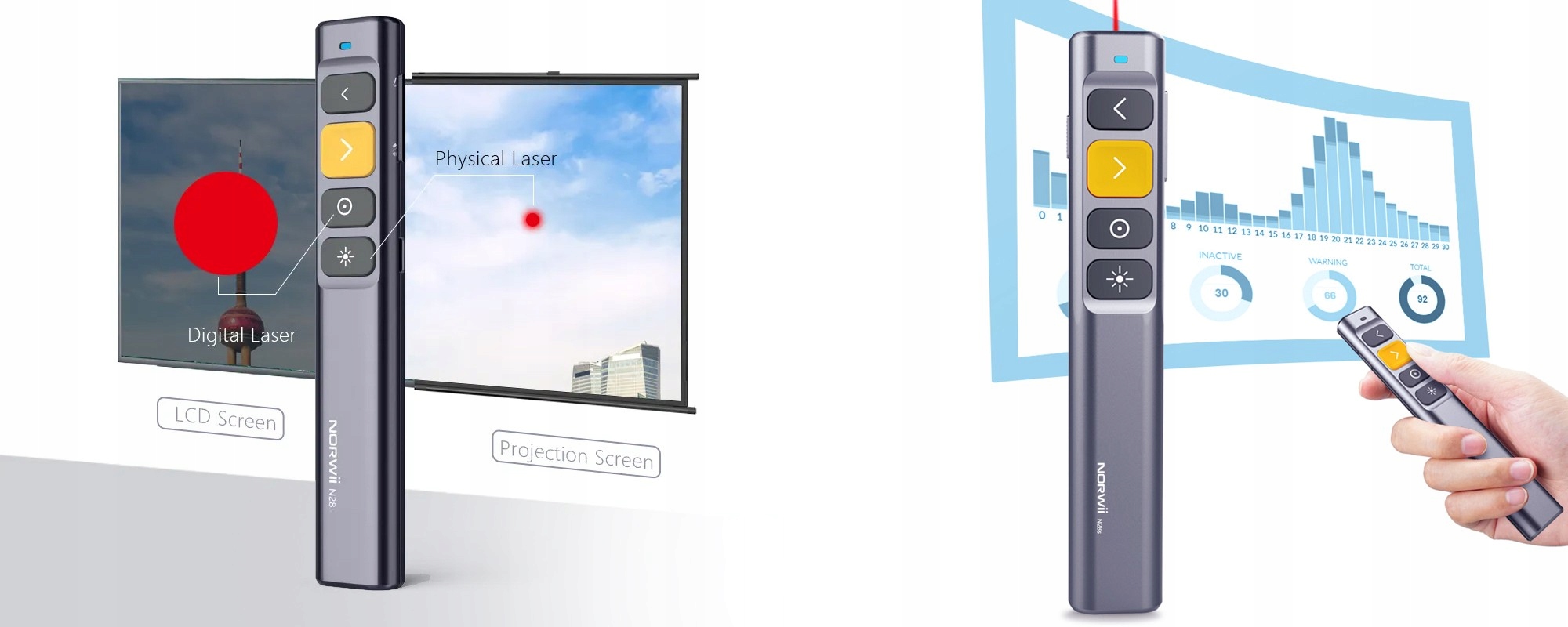 Пульт дистанційного керування Norwia N28s — це не лише керування слайдером. Вбудована лазерна указка дозволяє точно виділяти важливі елементи n