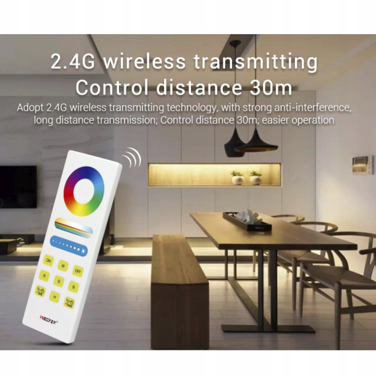 Зв'язок контролера з пультом дистанційного керування на частоті 2,4 ГГц здійснюється за допомогою радіохвиль, тому дальність дії пульта становить близько 30-50 м і може долати тонкі стіни. Завдяки цьому його можна повністю приховати.
