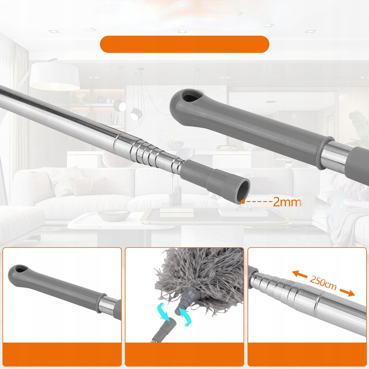 Наш телескопічний пилосос може бути розширений до 250 см (довжина з очищувальною головкою). Ви можете очистити більш високі поверхні, такі як стелі, жалюзі, стельові вентилятори, дахи, високі підвіконня та павутини. Очищена головка з м'якого мікроволокна захищає меблі та стелі від подряпин. Він прибирає всюди вдома, не маючи по сходах. Завдяки надзвичайно довгому дизайну, передня частина трохи м’яка; Це нормально, і для цього знадобиться певний час. Будь ласка, зрозумійте! Можна скоротити до 38 см, якщо це необхідно для зберігання.
