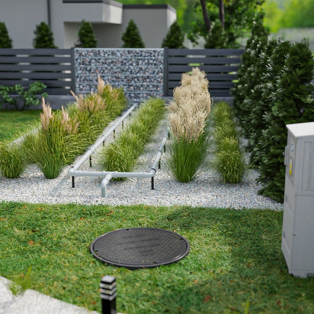 Dropgarden-це система розподілу очищених стічних вод у вигляді труб DN50 та арматури, що підтримуються 2-елементними ручками