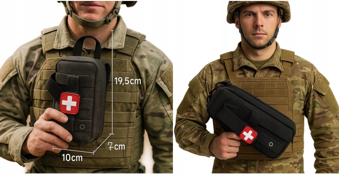 Тактична набору для першої допомоги у формі з поспільною машиною. Виготовлений з міцного матеріалу, стійкого до стирання та вологи. Ідеально носити на ремені, рюкзак або тактичний жилет завдяки системі кріплення молле. Внутрішній простір для базового медичного обладнання, лікарських засобів або невеликих аксесуарів. Розміри