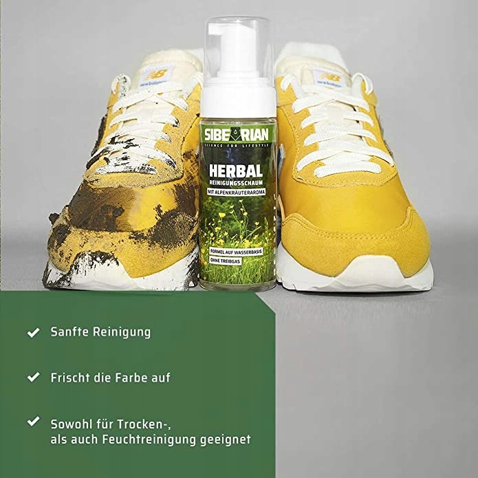 У вас є одяг або речі, які не можна прати в пральній машині? Незалежно від того, чи це спортивне взуття, велосипедні шоломи, сумки чи меблі для сидіння, деякі з них можна або просто не можна прати в машині. Ось чому ми створили пінний засіб для чищення, який ефективно та м’яко очищає більшість матеріалів – і водночас приємно пахне. Піна-очищувач HERBAL від SIBEARIAN м'яко, швидко і надійно очищає більшість матеріалів. Наш очищувач працює швидко та ефективно та очищає шкіру, замшу, гуму, пластик та інший текстиль. Він не тільки видаляє бруд і плями, але й нейтралізує неприємні запахи. Тоді залишається приємний аромат свіжих альпійських трав. Завдяки своїм універсальним властивостям наша миюча піна підходить не тільки для взуття чи спортивного одягу, але й для рюкзаків, сумочок і навіть меблів для сидіння. Він очищає надзвичайно ніжно, щоб не пошкодити делікатні матеріали.