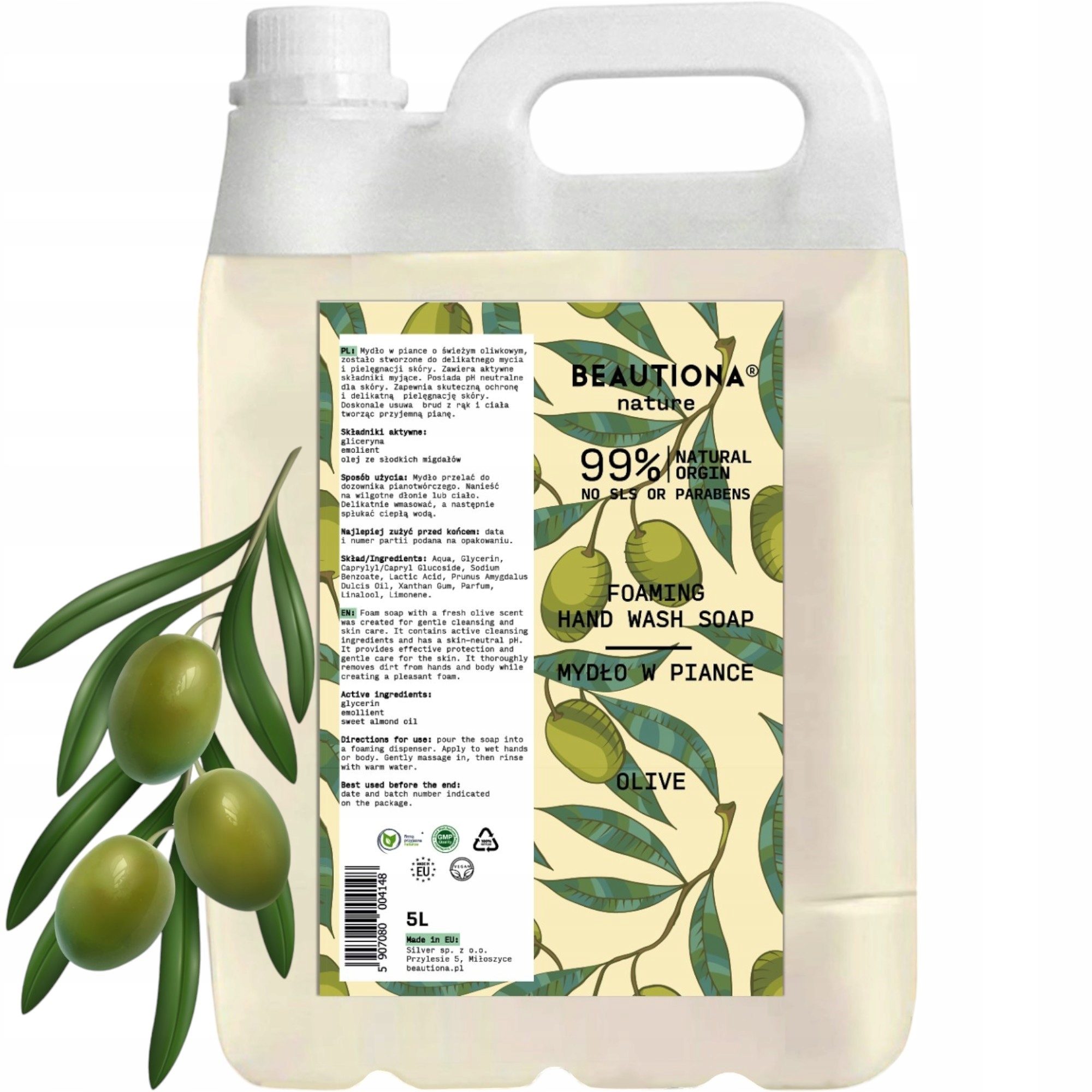 Шукаєте мило, яке ефективно подбає про шкіру рук і тіла? Нашемило-пінка з ароматом ОЛІВКИ- ідеальний вибір! Ніжна, але ефективна формула ретельно очищає шкіру, одночасно інтенсивно зволожує та доглядає за нею. Велика ємність 5 л робить продукт надзвичайно ефективним - ідеальним як для домашнього використання, так і для професійних дозаторів у громадських місцях.