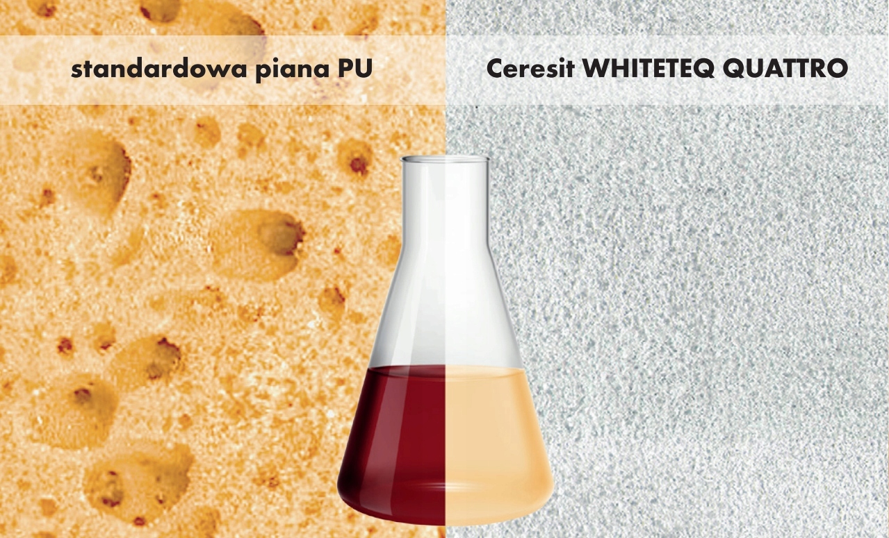 - Висока гнучкість і в 4 рази більша стійкість до ультрафіолету. Стандартні поліуретанові піни часто недостатньо стійкі до механічних факторів. Вища еластичність піни WHITETEQ QUATTRO виключає ризик тріщин у структурі та забезпечує максимальну довговічність.
