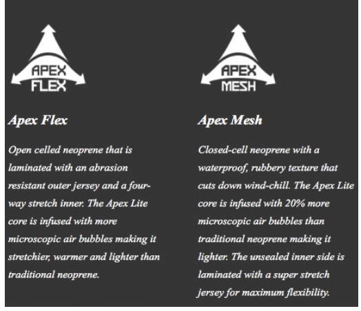 - Верхня частина гідрокостюма виготовлена з легкого та дуже гнучкого неопрену Apex-Flex, покритого з обох сторін нейлоновою в’язкою, яка значно підвищує довговічність неопрену та стійкість до пошкоджень, наприклад, через випадкове зачеплення.