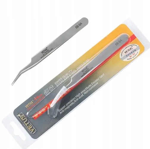Пінцет Vetus 5B-SA від відомого швейцарського виробника інструменту «Vetus» відрізняється підвищеною якістю виконання, виготовлений з антикорозійної неполімагнітної нержавіючої сталі, легкий і зручний у використанні. Гнучкість і легкість ходу гнізд достатня для комфортної роботи протягом тривалого часу (із занадто жорстким пінцетом робота може бути ускладнена, тому що необхідно прикладати силу для натискання). В наявності багато моделей пінцетів «Ветус». Площа контакту достатня для проведення якісної процедури.