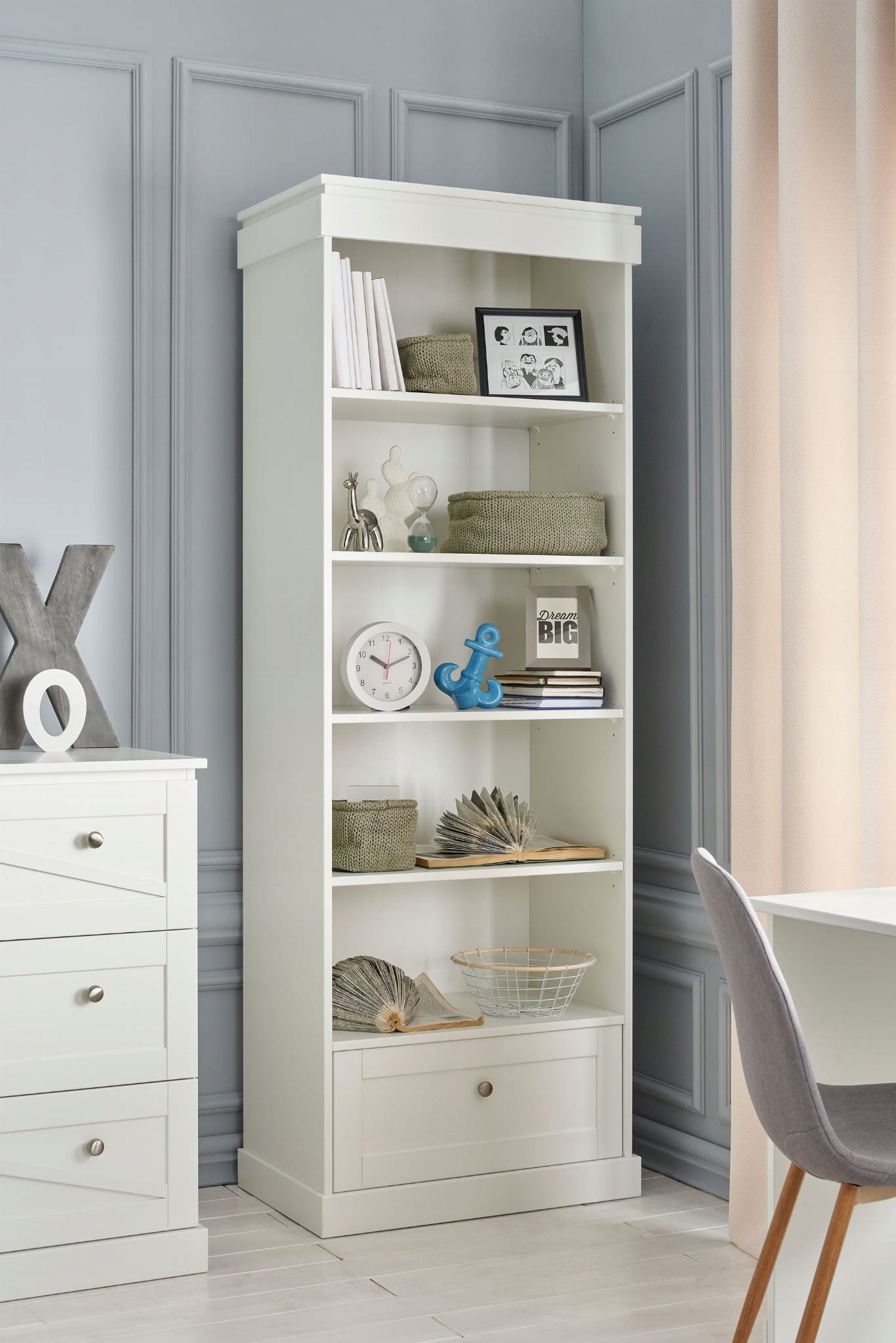 - Книжкова шафа відкритого типу має 4 полиці та одну шухляду, оснащена якісною направляючою з гальмом та механізмом самозакривання.