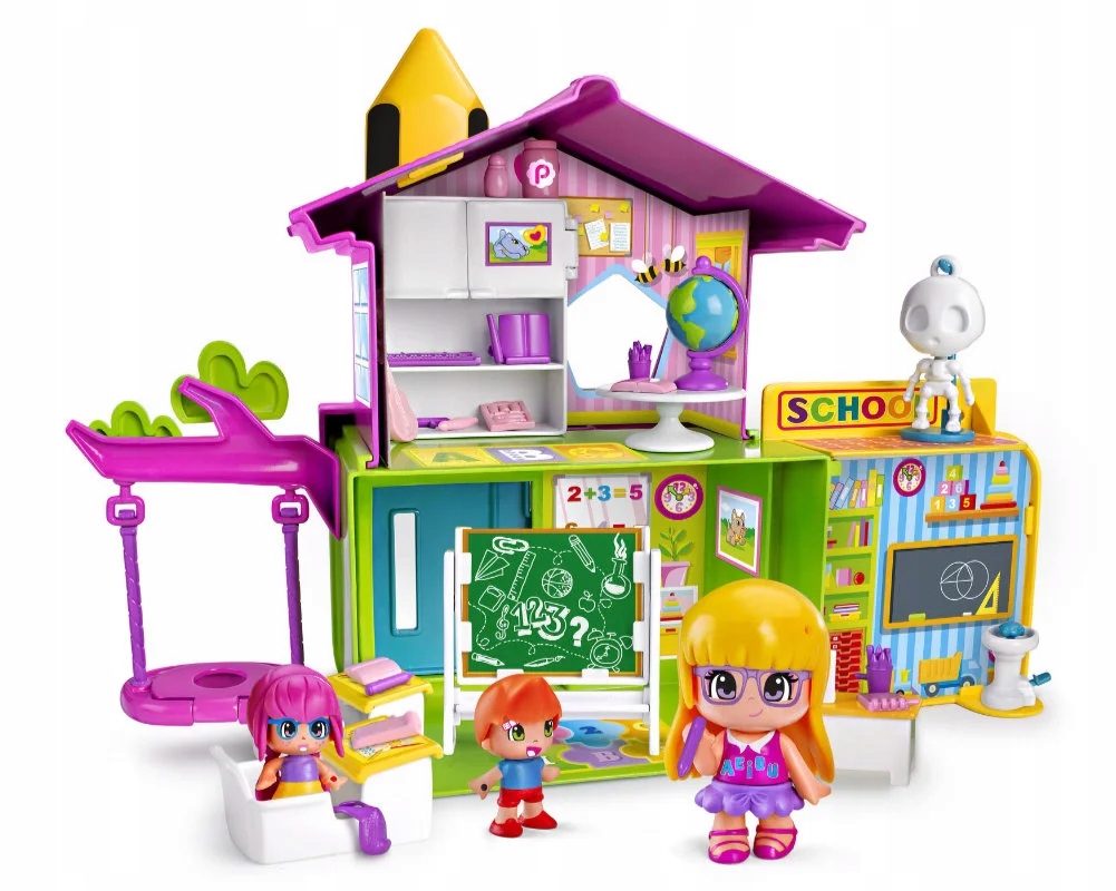 У цьому наборі є все, що вам потрібно для навчання та гри. Дошка, парти та стільці для учнів, скелет для вивчення будови тіла людини, гойдалки, баскетбольний майданчик та багато іншого!