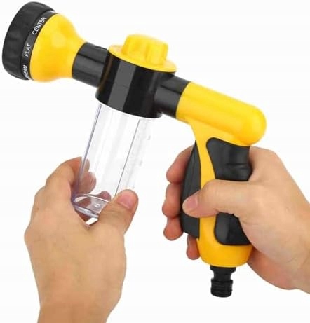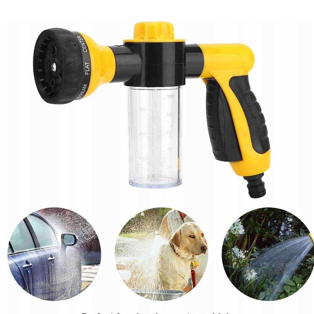 Цей пінний пістолет можна використовувати для очищення землі, вікон, під’їздів, дахів, миття автомобілі, поливання квітів, поливання газонів, догляд за домашніми тваринами тощо. За допомогою знімного адаптера його можна адаптувати до двох різних типів водопровідних труб і використовувати при підключенні до садової труби, яка є дуже гнучкою.