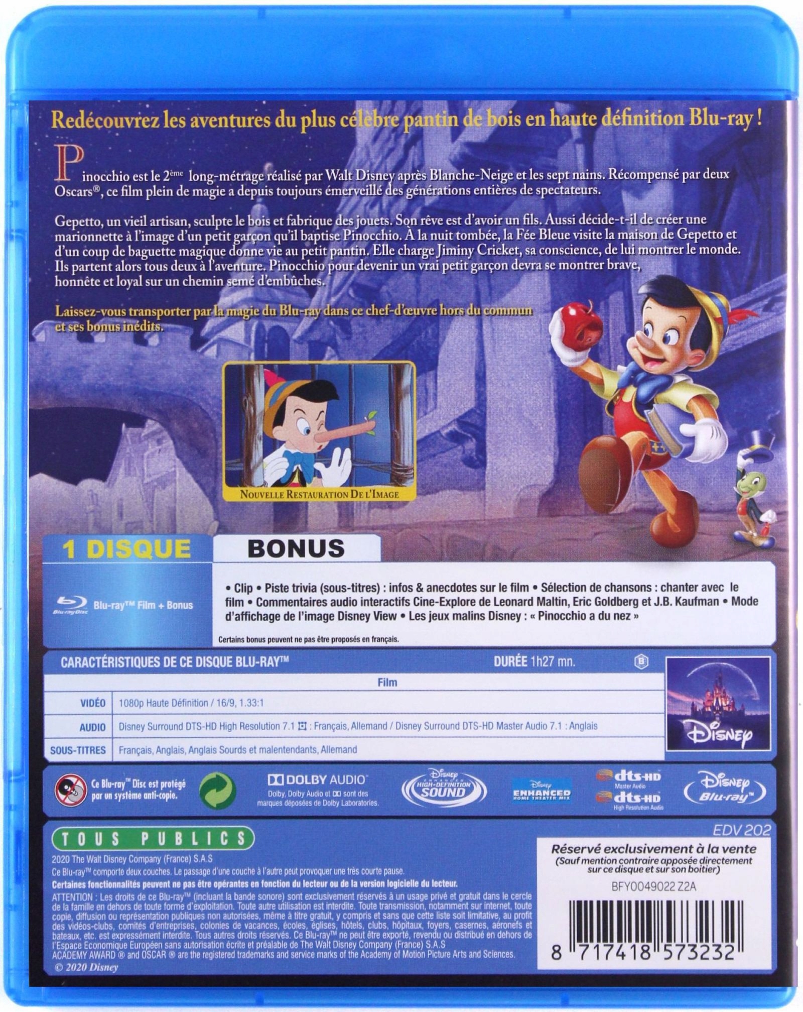 Дивіться «Піноккіо» Уолта Діснея у форматі Blu-ray високої чіткості найвищої якості! Легендарний шедевр, який вчить завжди вірити у свої мрії, відродився завдяки повній реконструкції та сяє ще прекрасніше, ніж будь-коли! Дивіться насичену та деталізовану анімацію, незабутню музику, відзначену нагородами, і зворушливу пригоду, що оживає, доповнену приголомшливими новими спеціальними програмами, які перенесуть вас у фантастичний світ Піноккіо!