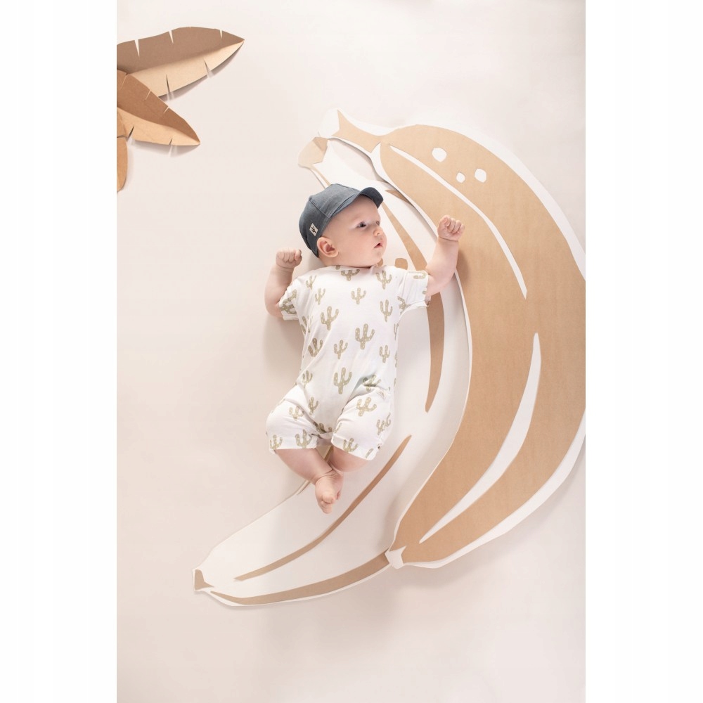 Дитячий комбінезон з коротким рукавом колекції Free Soul виготовлений з ніжної бавовни кольору екрю, прикрашений цікавим принтом зелених кактусів. В якості прикраси на лівому стегні ми помістили витончену нашивку з написом FREE SOUL. Дитячий повзунок є обов'язковим елементом літнього ліжка для новонародженого. Виготовлено в Польщі та має сертифікат «Безпечно для дітей».