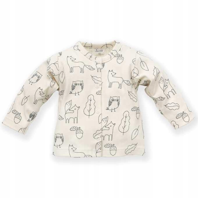 Зручний кафтан Екру в відбитках та листя лісових тварин, які були виготовлені міцним і безпечним методом водних фарб. Можливість розстебання по всій довжині полегшує одягання та роздягання дитини. Для виробництва знімків використовувався анти -алергічний пластик без додавання нікелю. Куртка є важливим елементом дитячої митоти. Це можна вільно поєднувати з іншим одягом із таємної лісової колекції, створюючи цікаві стилі. бавовна