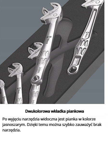 Міцна пінопластова вставка; двокольоровийщо дозволяє швидко визначити відсутні елементи; підходить до візка для майстерніTool Rebel; оснащений 5 саморегульованими гайковими ключами Wera 6004 Joker.