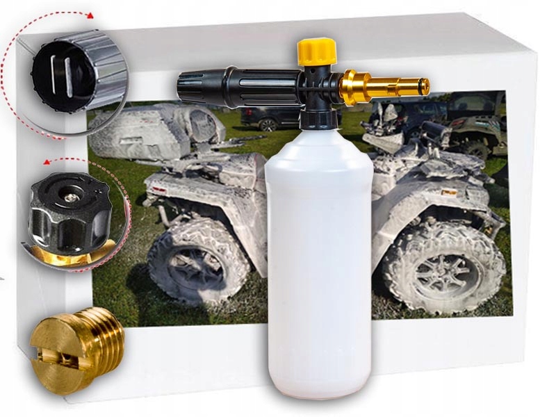 Пістолет для піни працює ідеально з усіма видами миючих засобів, таких як: активна піна, шампунь з воском і без нього, гідровіск і багато інших. Ємність пляшки 1 л. Міцний корпус гарантує тривале та безвідмовне використання. Напівпрозорий хімічний резервуар дозволяє бачити та контролювати витрату хімікату. Пінний пістолет має регулювання кута струменя води з піноюі кількості хімікатів, що подаються.