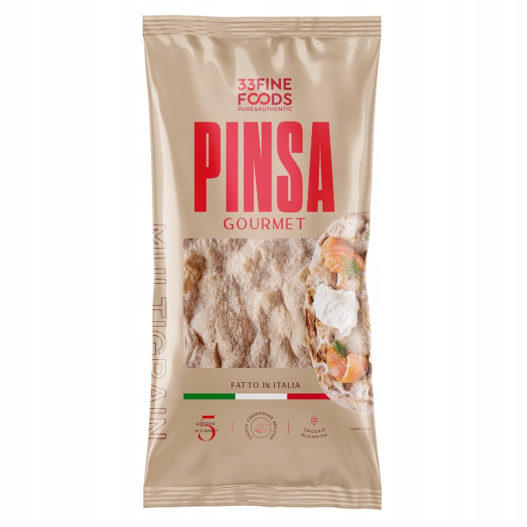 Pinsa, що є римським еквівалентом піци, є унікальним продуктом серед плоских хлібців. Відрізняється надзвичайною соковитістю, ніжністю та легкою засвоюваністю, що обумовлено тривалим процесом бродіння та особливим поєднанням борошна. Pinsa Gourmet Multigrain додатково збагачений сумішшю різних зерен, що робить його не тільки смачним, але й надзвичайно корисним. Мультизернова пінса забезпечує додаткову клітковину, вітаміни та мінерали, що робить її ідеальним вибором для людей, які піклуються про здорове харчування. Завдяки цьому мультизернова пінса стає не тільки смачною, але й корисною для всіх.