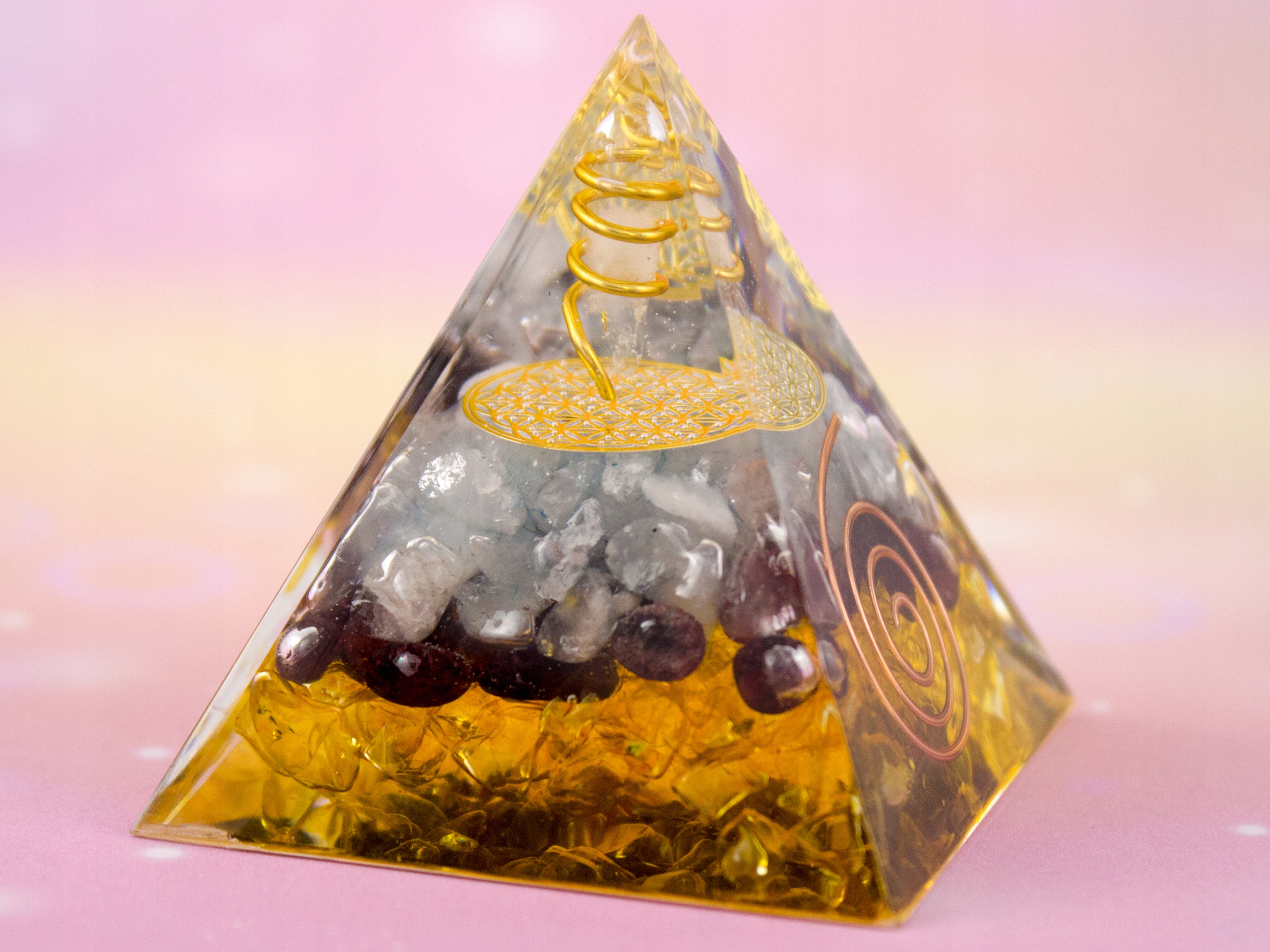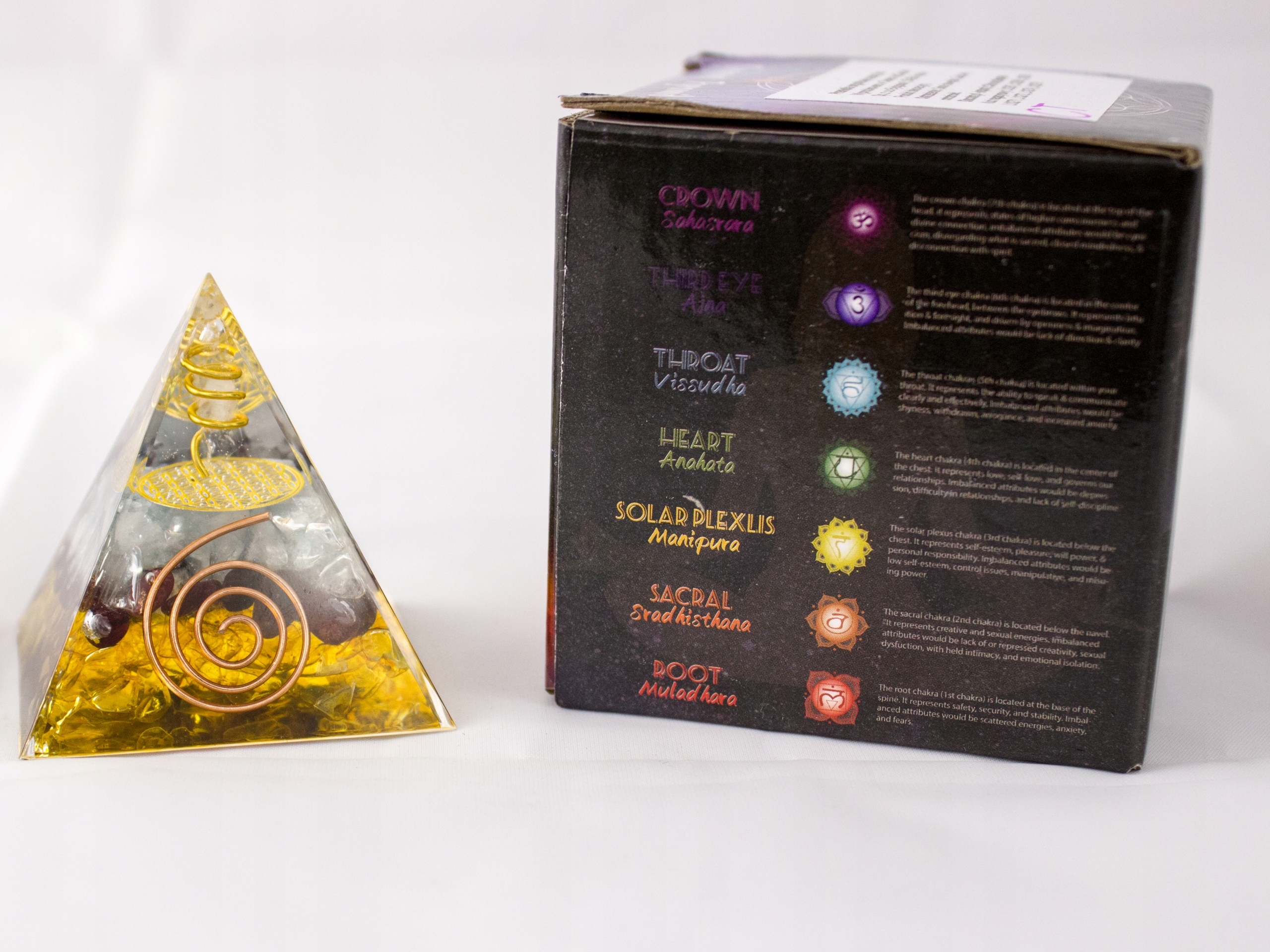 Ця піраміда благотворно впливає на кожну із семи чакр, а завдяки каменям і мінералам, які не тільки виглядають красиво, але й мають власну силу, енергію та зцілення, вони посилюють цінний ефект очищення та розблокування чакр, що приносить добро, щастя, здоров’я.