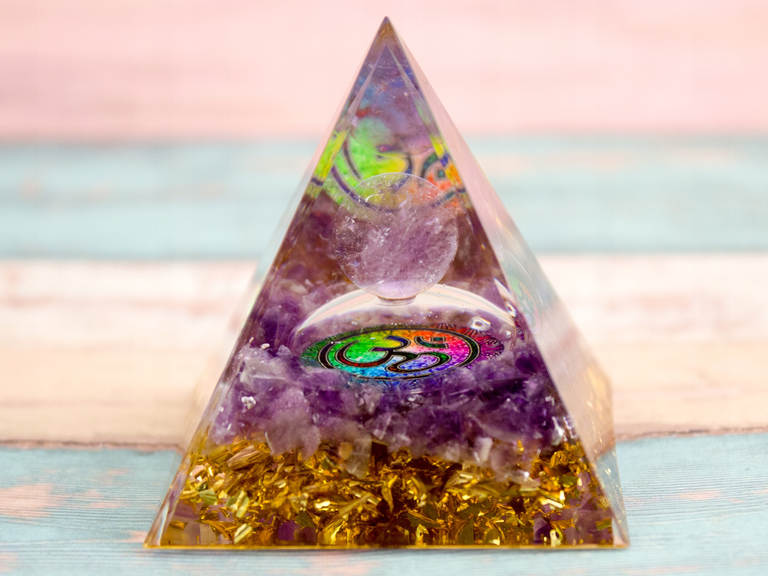Красива піраміда-оргоніт із барвистим символом нескінченності OM - натуральний аметист, красива прикраса з аметистовою кулею, виготовлена зі смоли та блискучої золотої фольги. Піраміда, що випромінює енергію, яка дає рівновагу і баланс, зміцнює здоров'я і сприяє успіху в різних сферах і сферах життя.