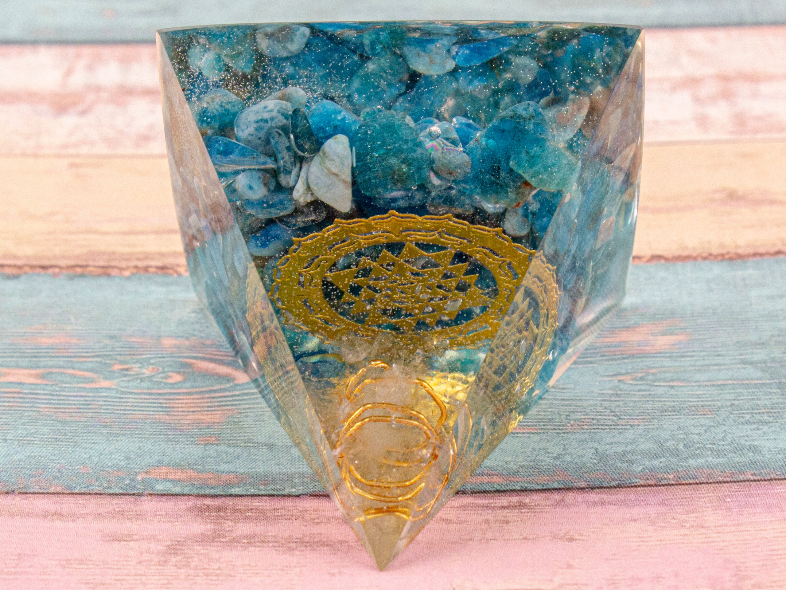 Краса та потужність впливу енергії, укладені в унікальну піраміду оргоніту. Посилення інтуїції, досягнення внутрішнього балансу та стимулювання творчості. Це допомагає мати справу з духовними путівниками. Зміцнює концентрацію та пам’ять. Це камінь виконаних мрій і допомагає досягти великих наслідків від власних дій. Зміцнює імунну систему. Це посилює дію дорогоцінних каменів. Через мідний символ Шрі Джантри, всередині піраміди, вона буде корисною для медитації, ясновидіння та для жінок зміцнить інтуїцію та жіночність, також додавання певності ти сам Білий) смола мідь