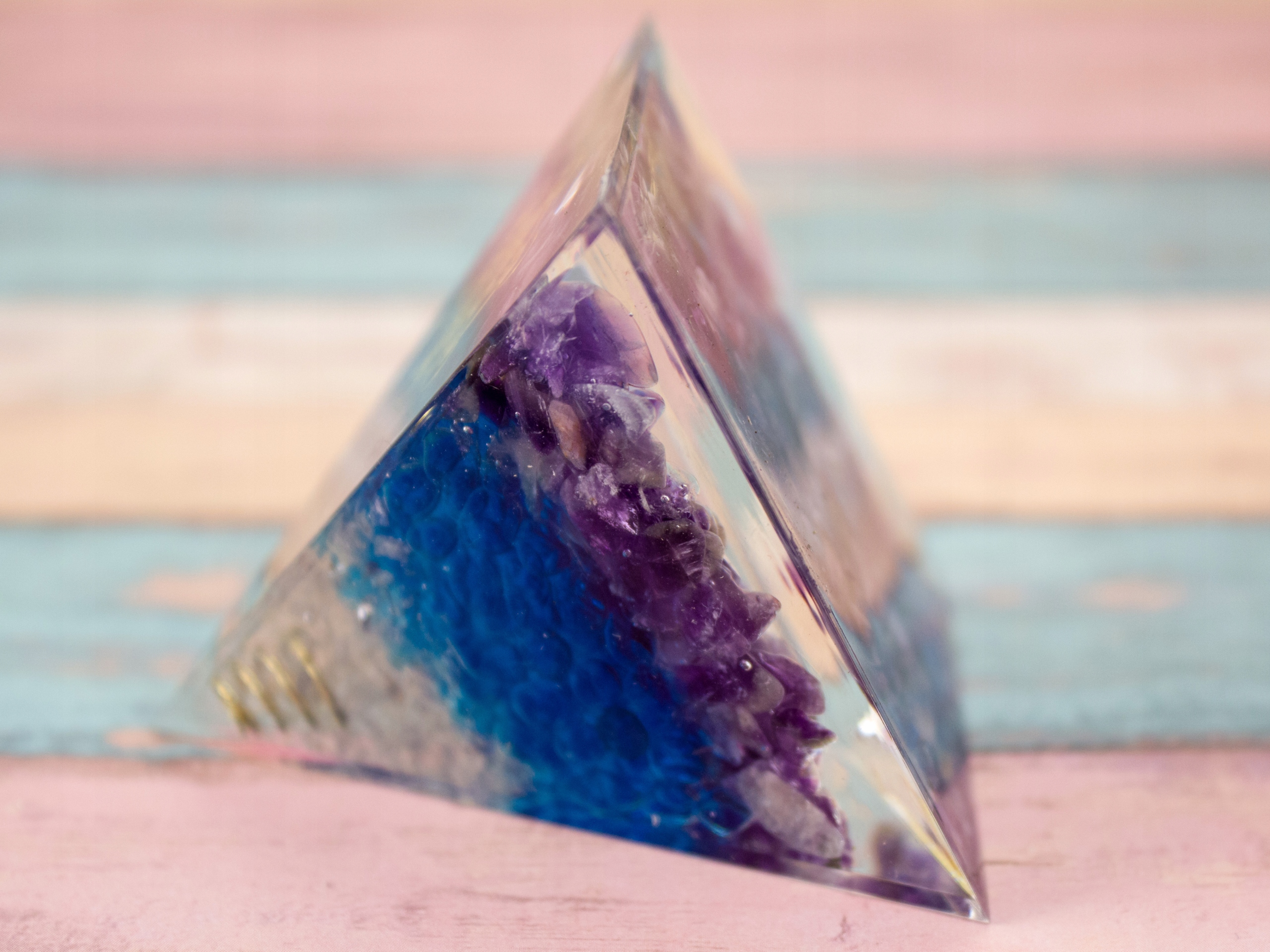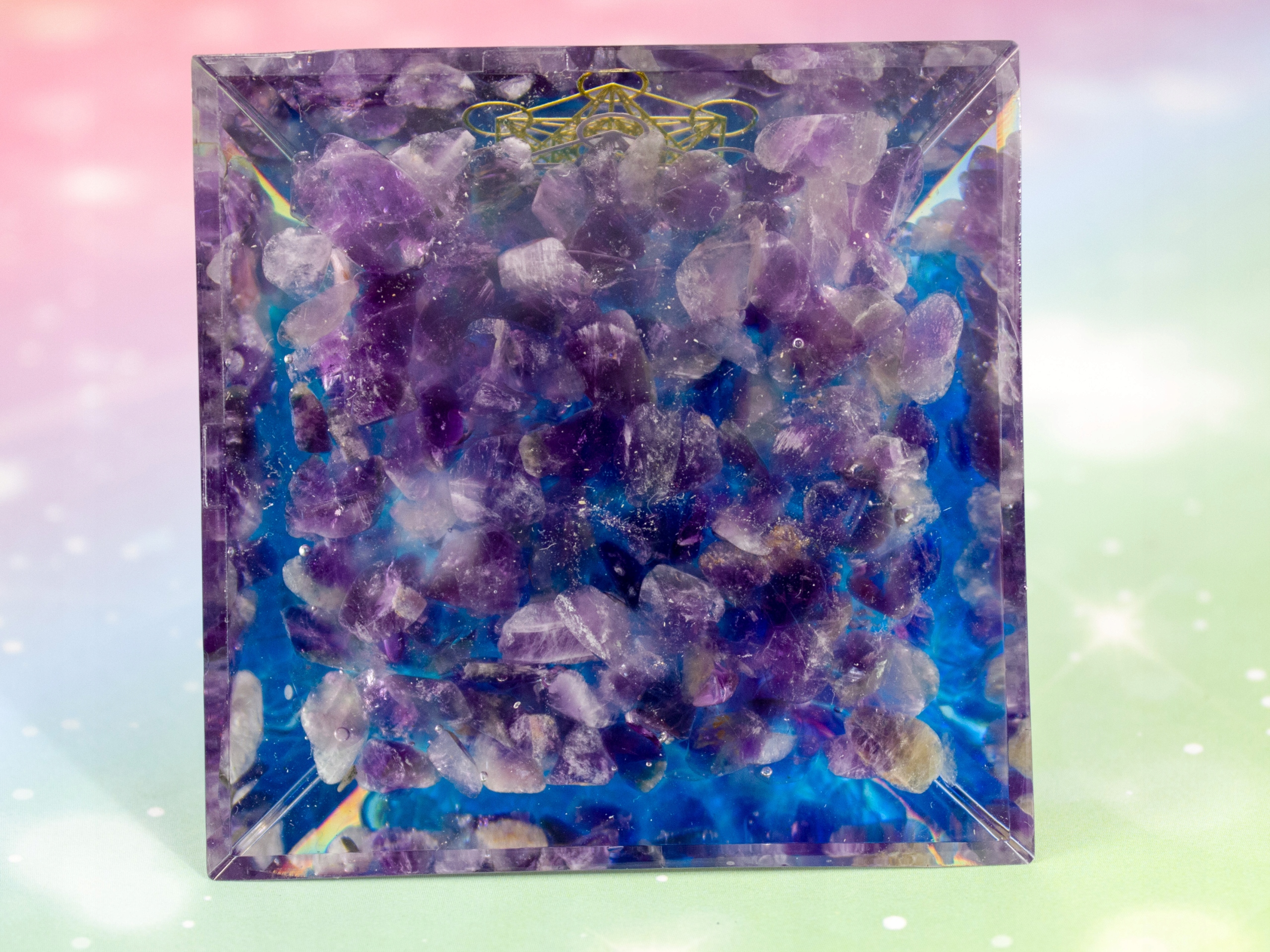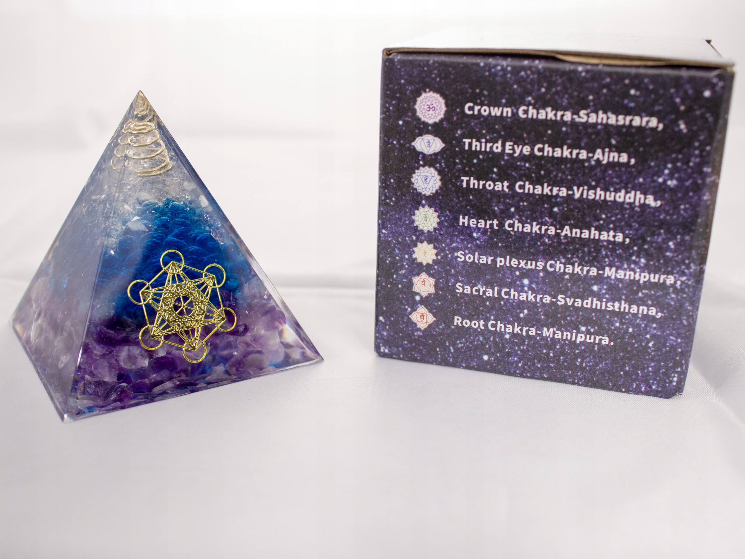 Красива оргонітова енергетична піраміда з гірським кварцом на самій вершині, інтенсивно блакитним скляним гравієм, який чудово виглядає на світлих і фіолетових каменях аметистів, з символ куба Метатрона на передній стінці.