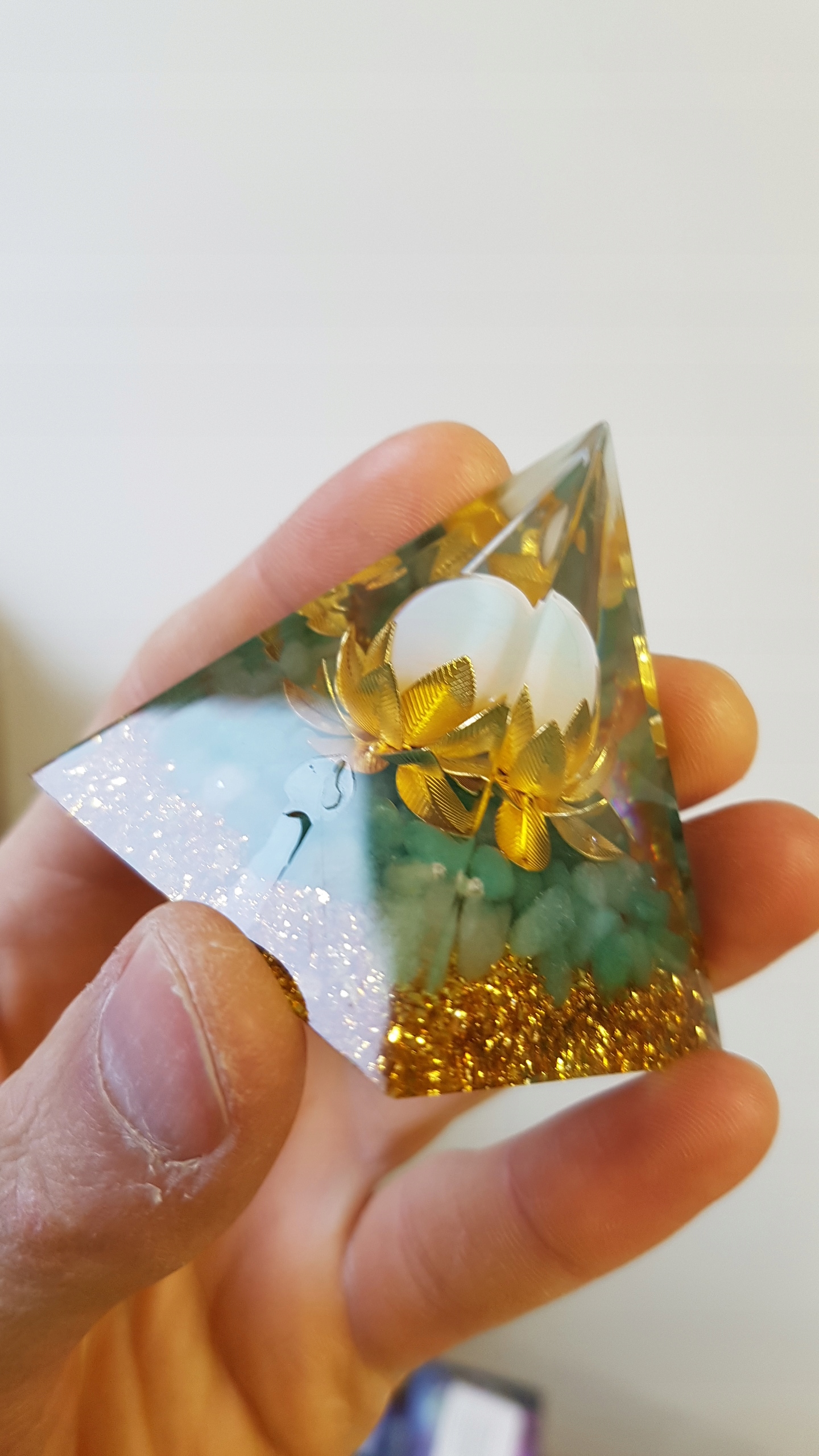 Піраміда orgonit jadeit зелена квітка лото -агат біла золота фольга 5см