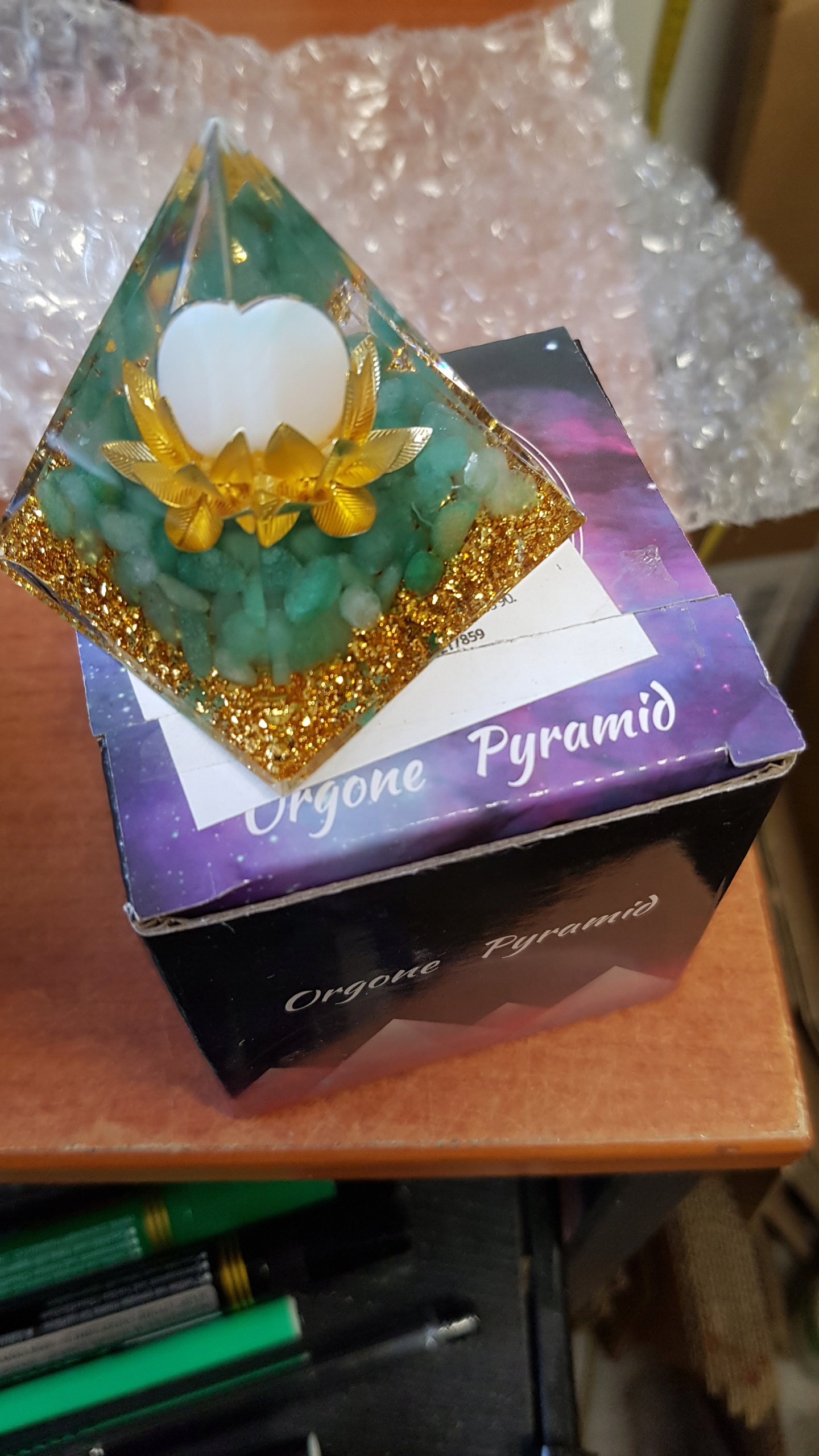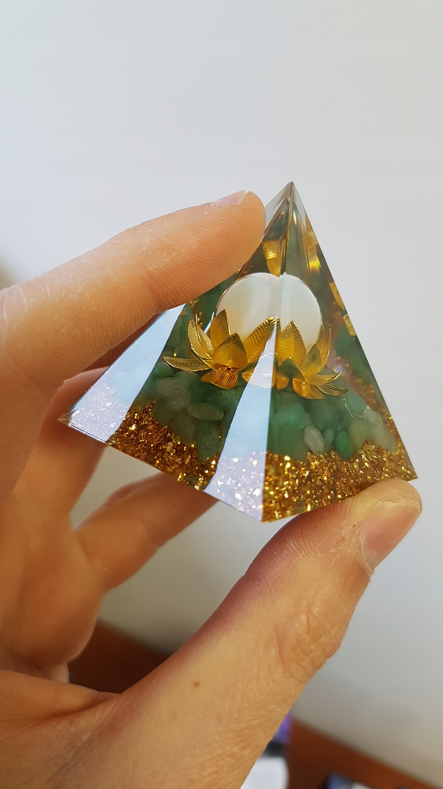 - дивовижна піраміда оргоніту з агатом, білим у вигляді прекрасного кулі на символі міді лотоса, яка символізує духовну трансцендентність. Делікатні коливання зеленого зеленого нефриту оточують всю піраміду, створюючи гармонійну ауру, що сприяє миру та рівновазі.