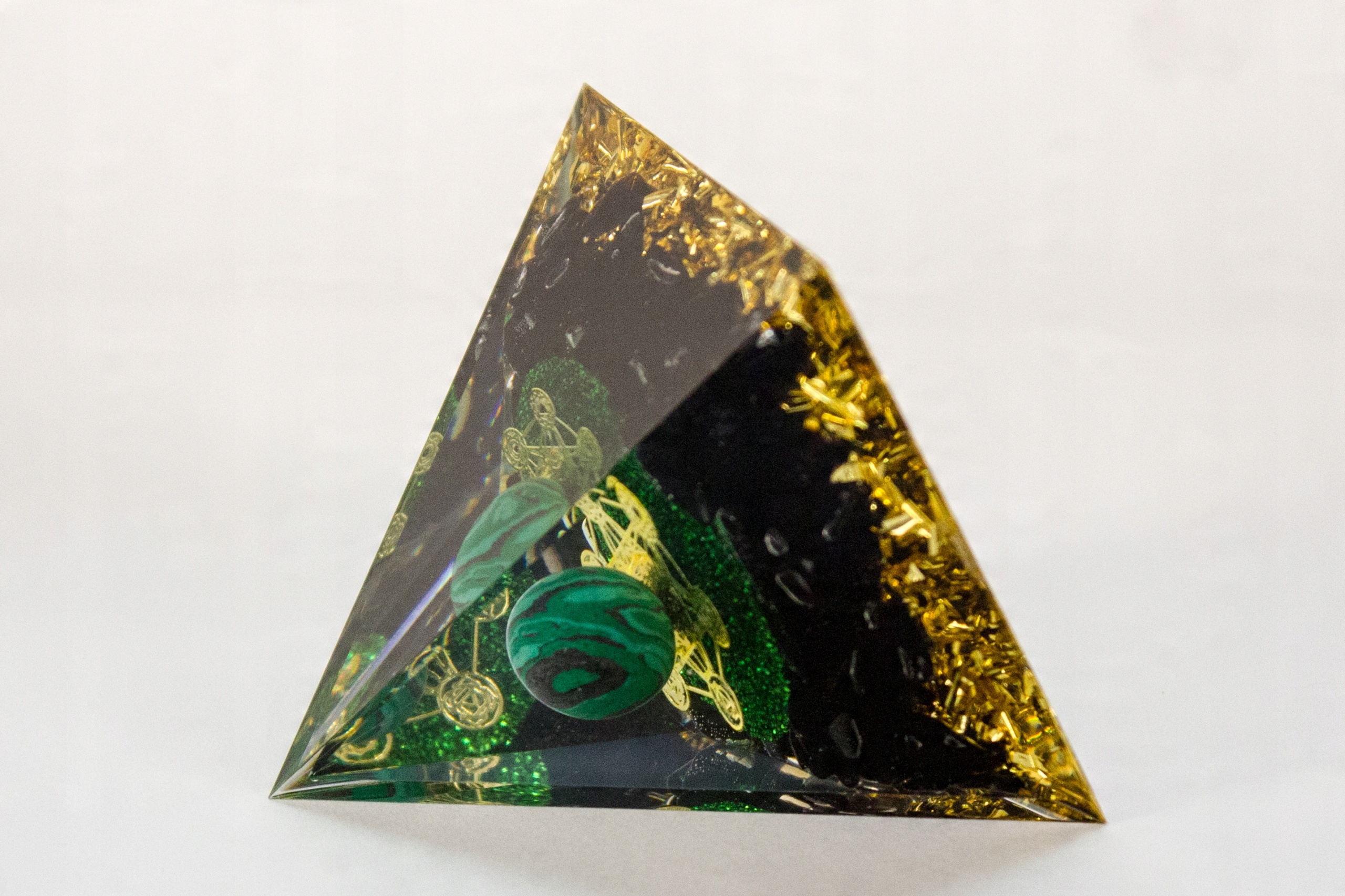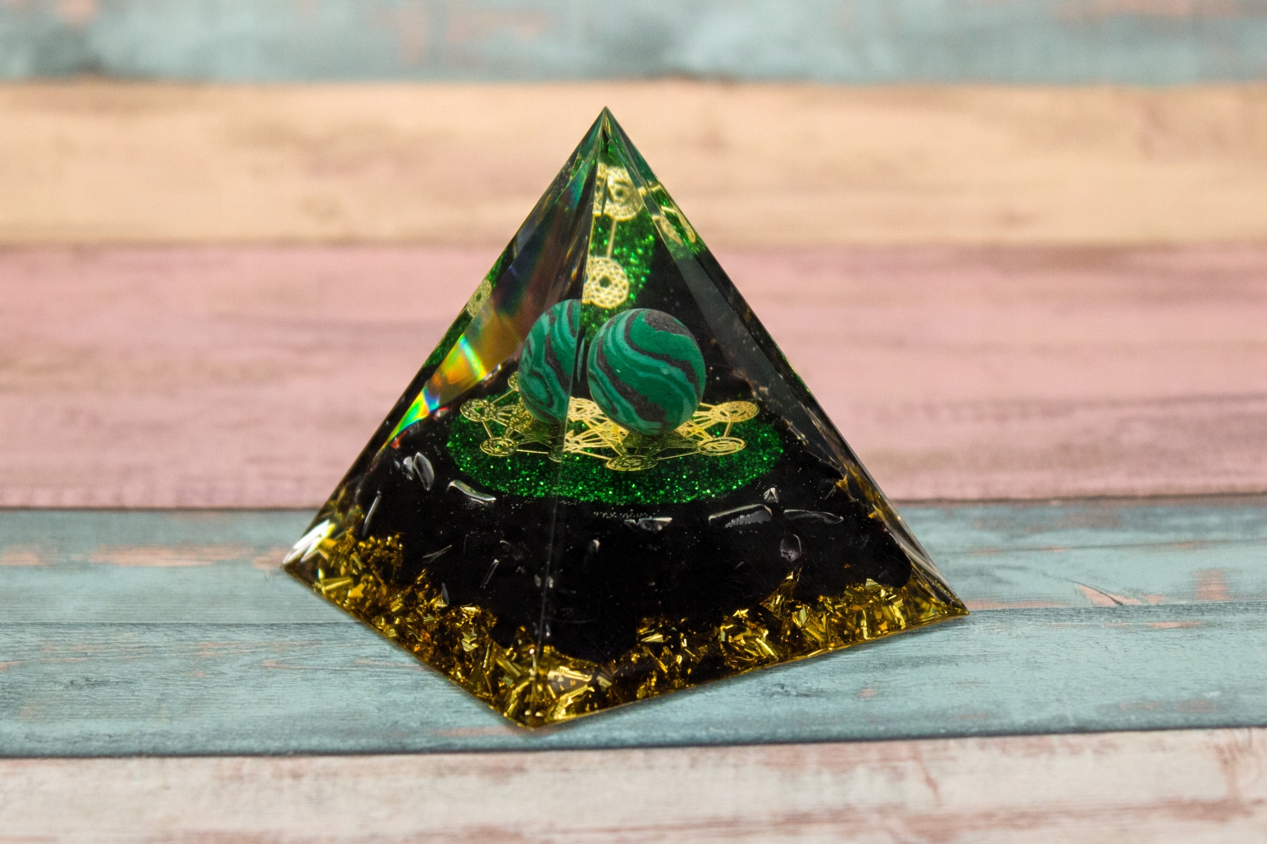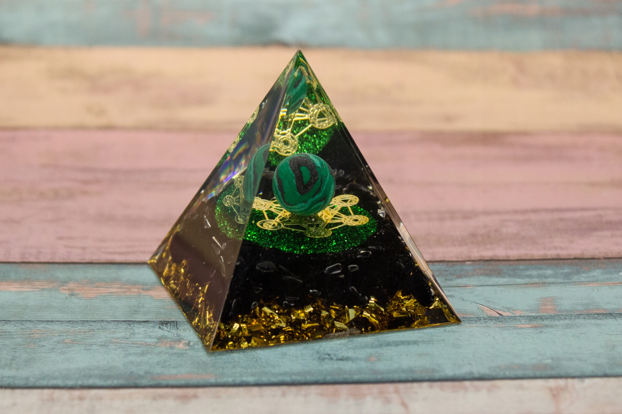 Цілюща, заспокійлива енергія, трансформація поганої енергії в добру - краща творчість, мир і злагода, успіх у професійних та ділових справах!!! h2 >Прекрасна оргонітова піраміда – малахіт, красива прикраса з міді, Куб Метатрона та золоті шматки фольги, що додають енергії та захисту всьому тілу, а також мудрості та творчого натхнення.