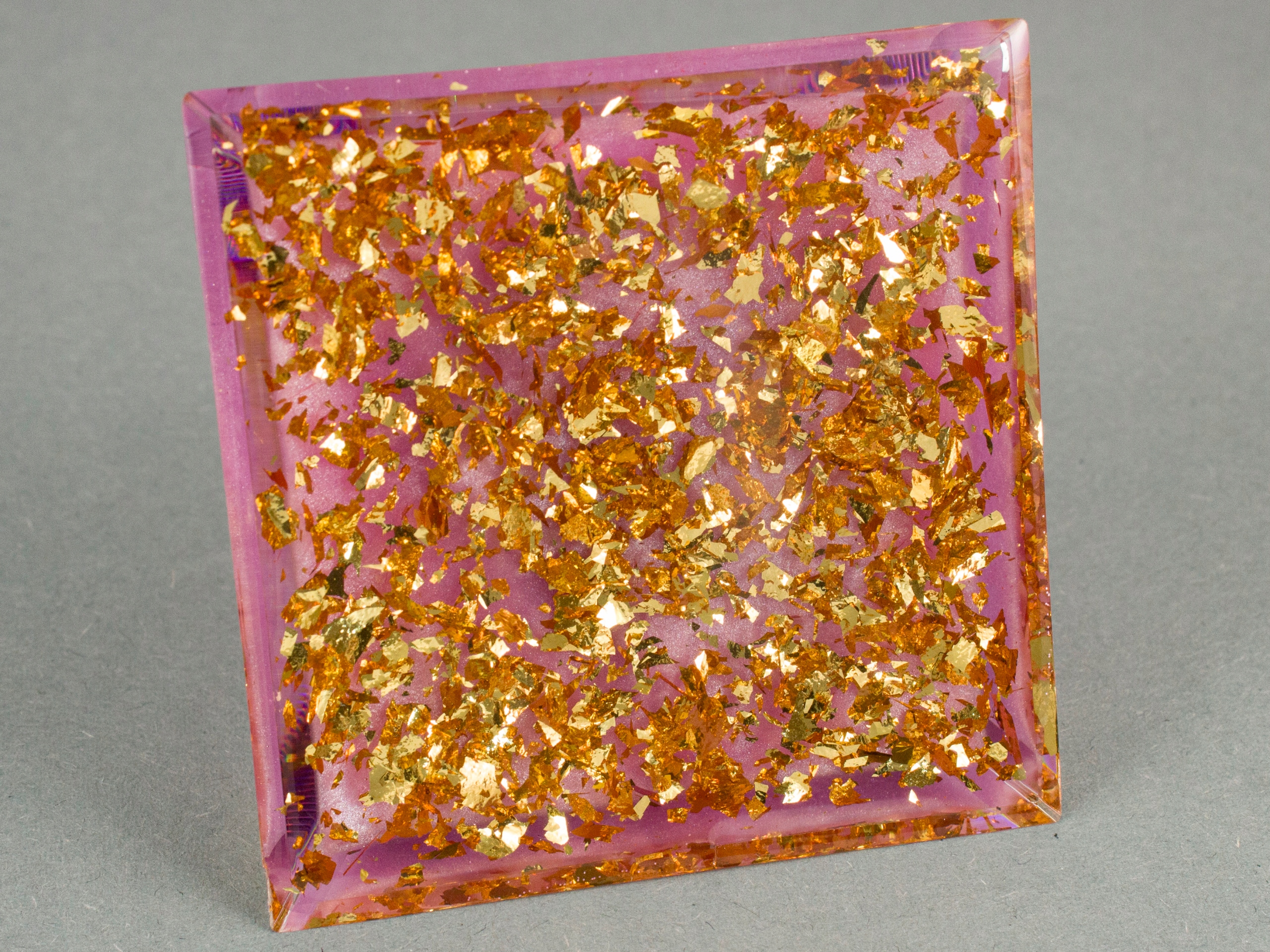 Ця прекрасна піраміда з рожевою смолою, всипаною як крихітні різнокольорові піщинки, з фіолетовими пружинами в кутах: