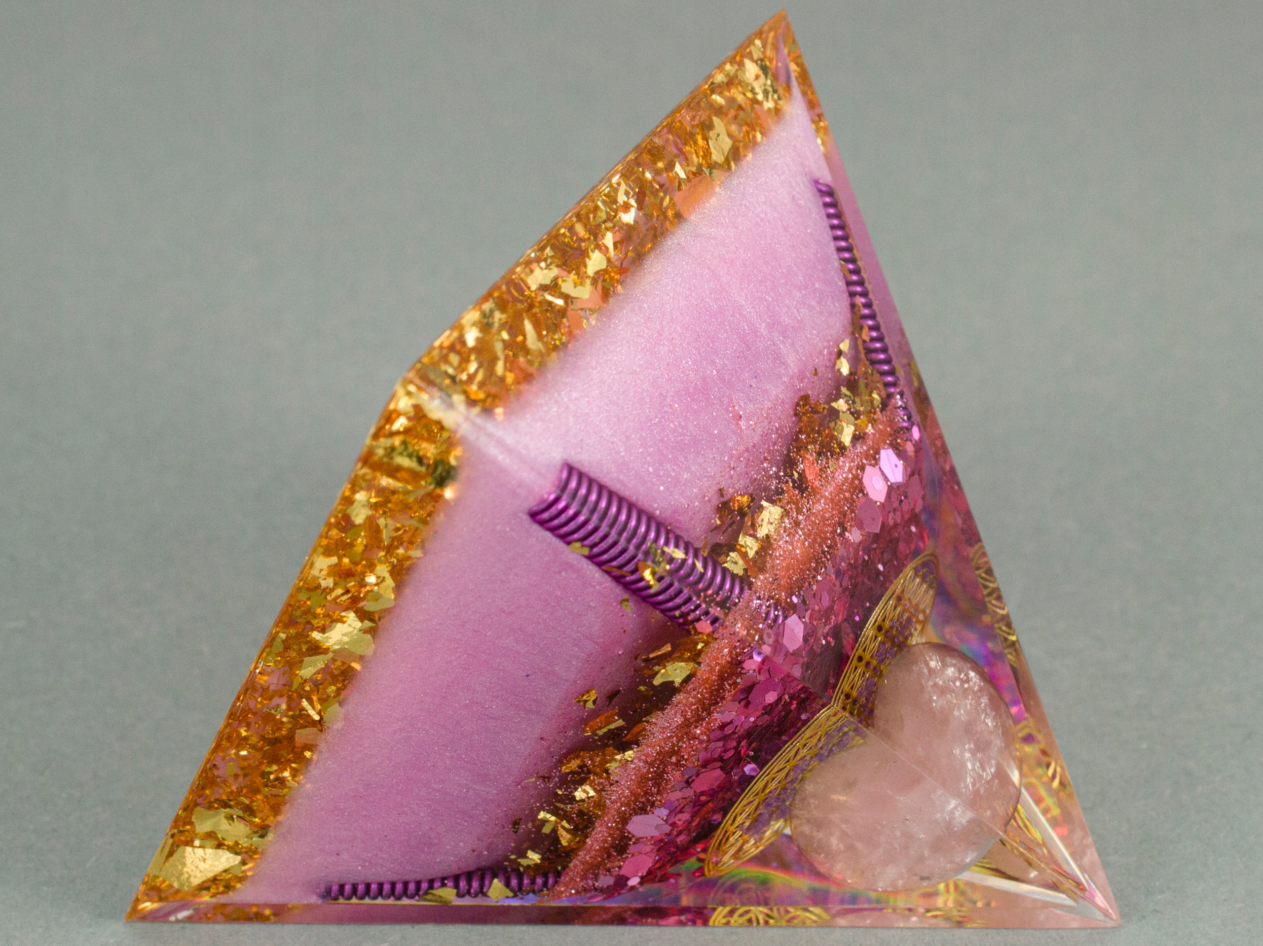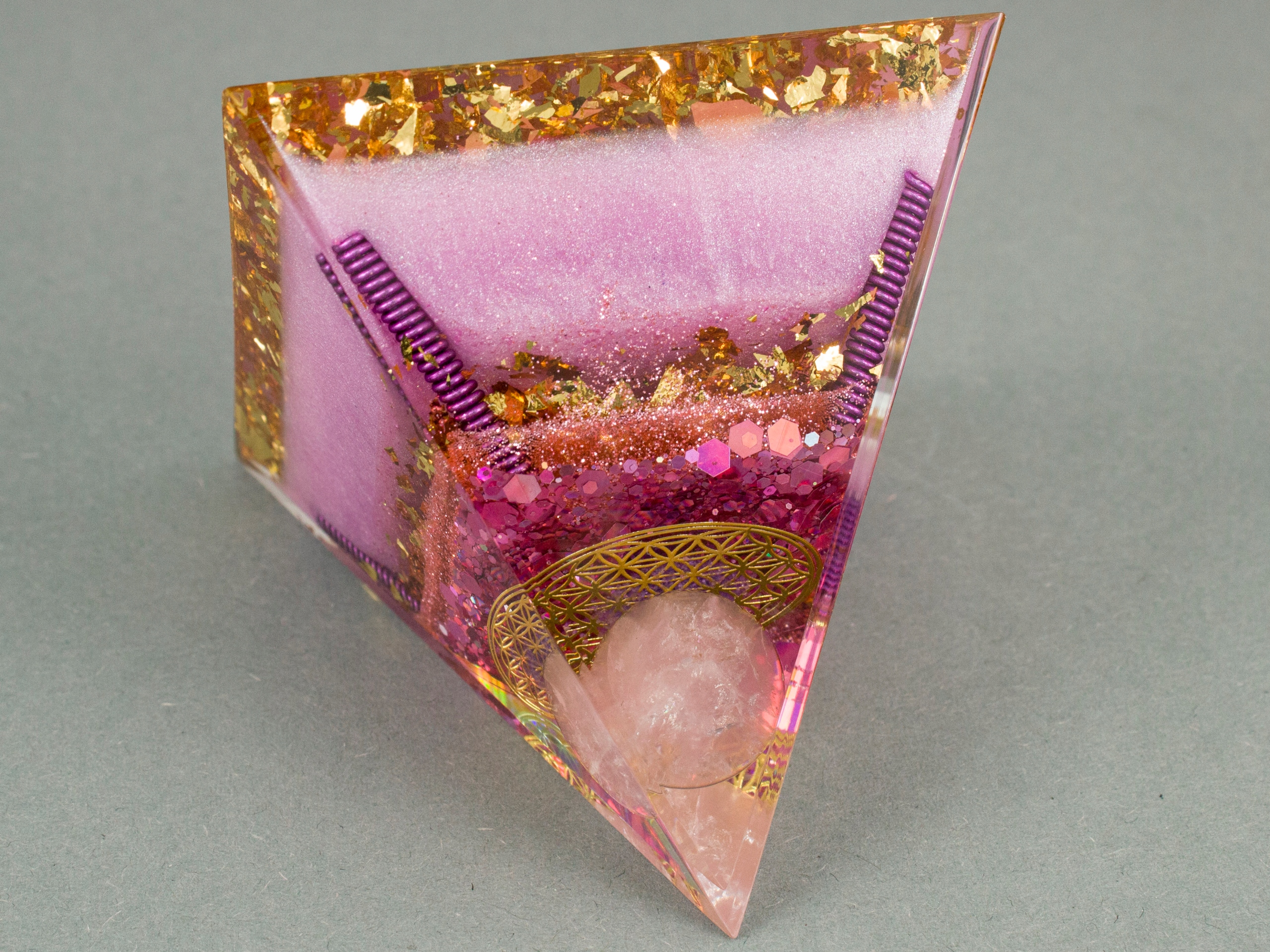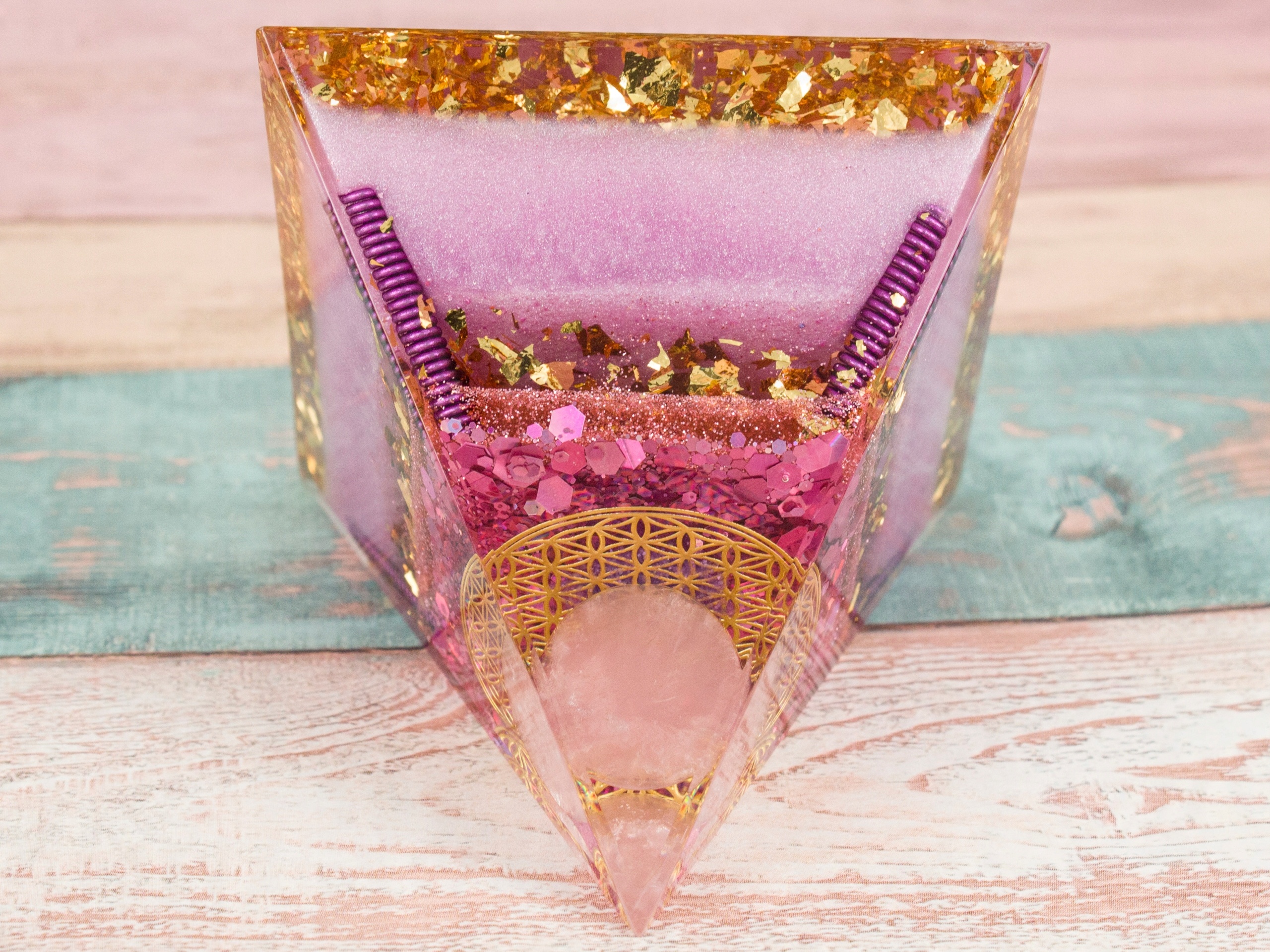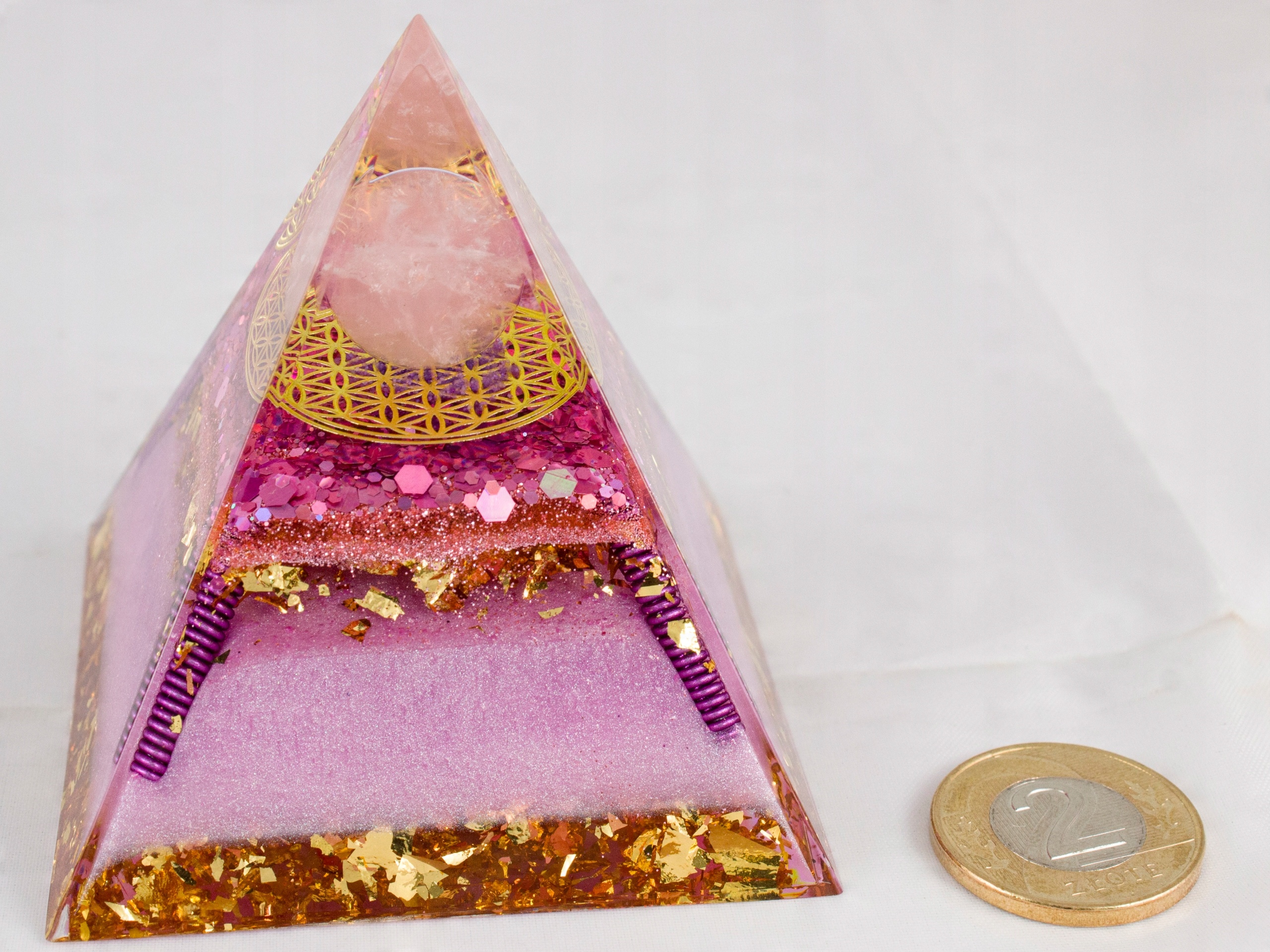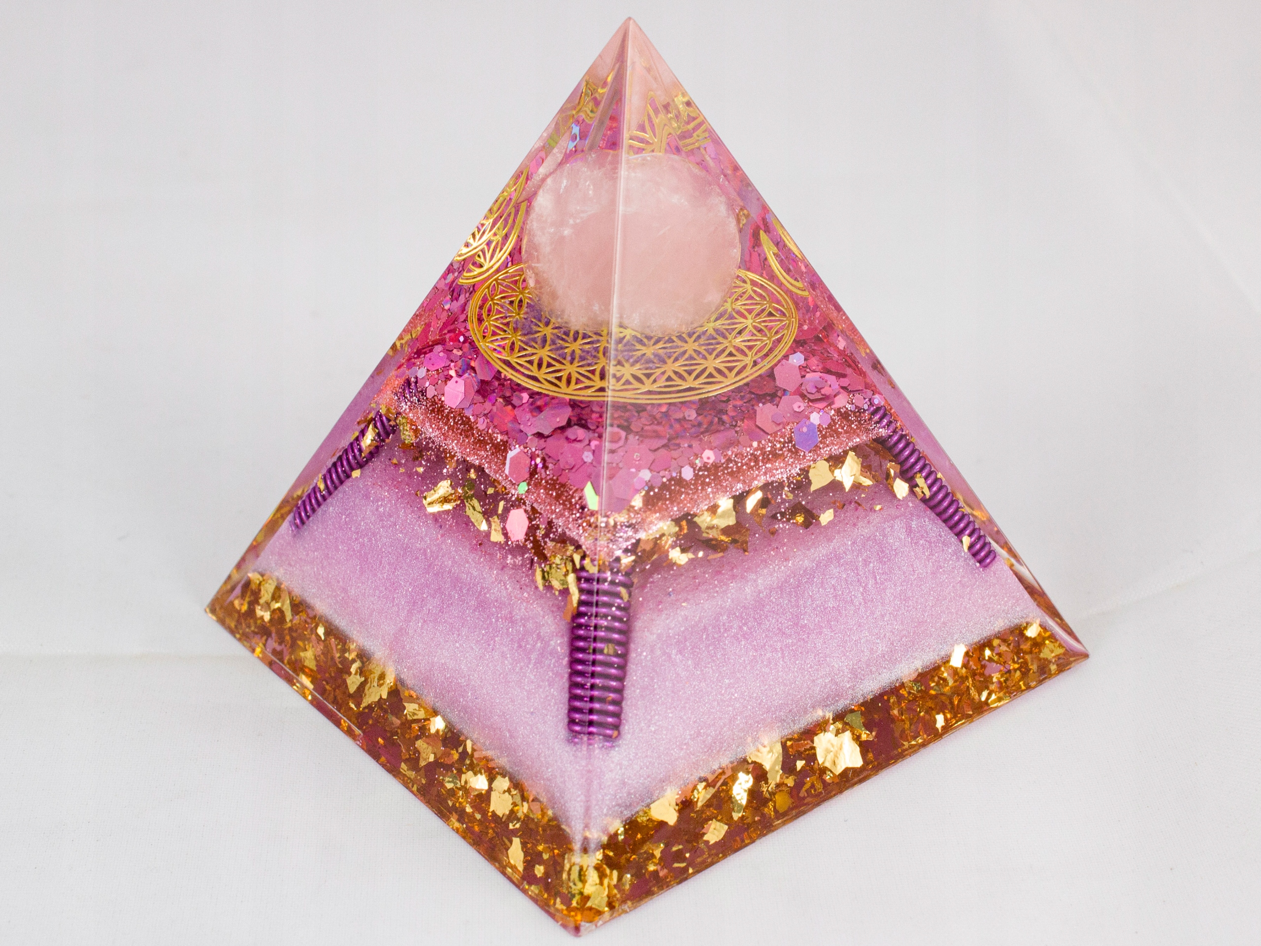 Відкрийте для себе силу чудової, переважно рожевої оргонітової піраміди, прикрашеної блискучим блиском, з рожевою кришталевою кулею, символом Квітки Життя у вигляді мідного щита всередині під кришталевою кулею з частинками аметисту.