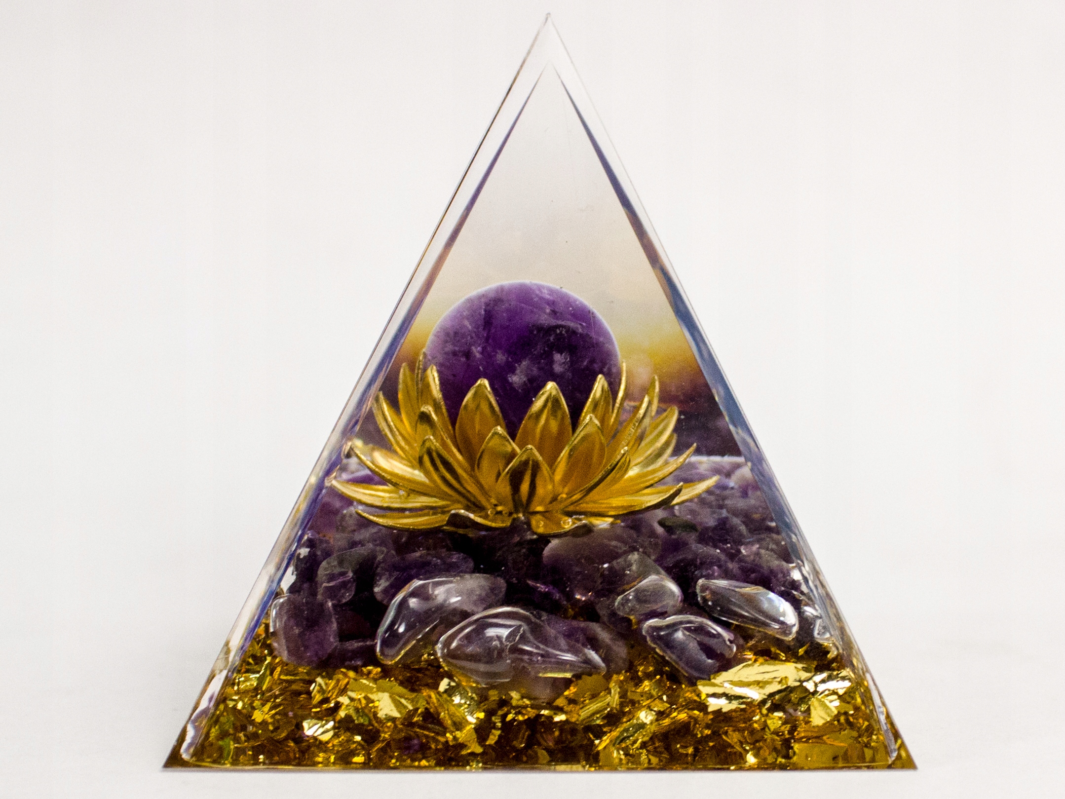 Оргонітова піраміда - емоції, стосунки, допомога при безсонні, зняття стресу, гарне оздоблення аметистом, міддю, смолою та шматками золотої фольги.