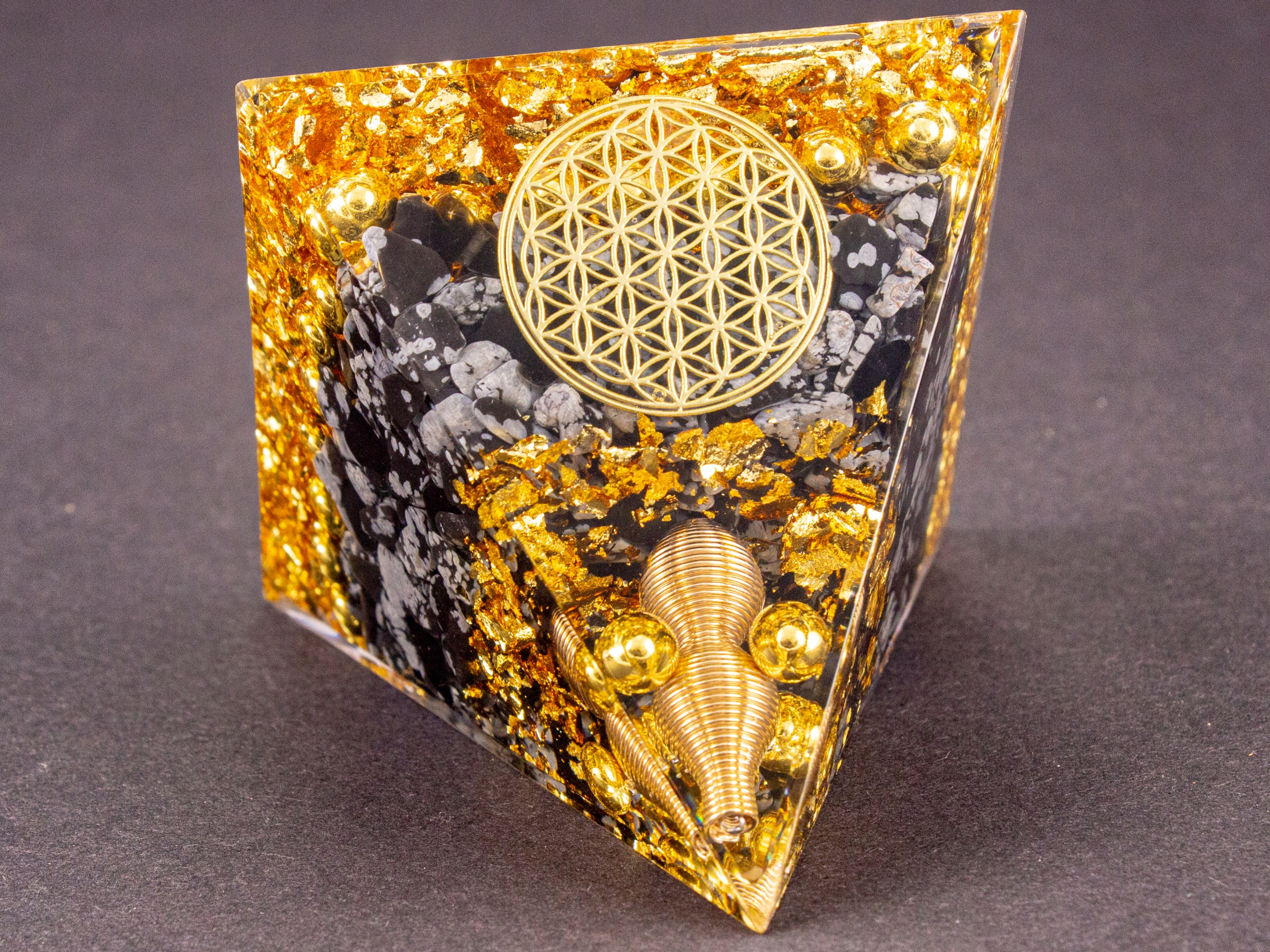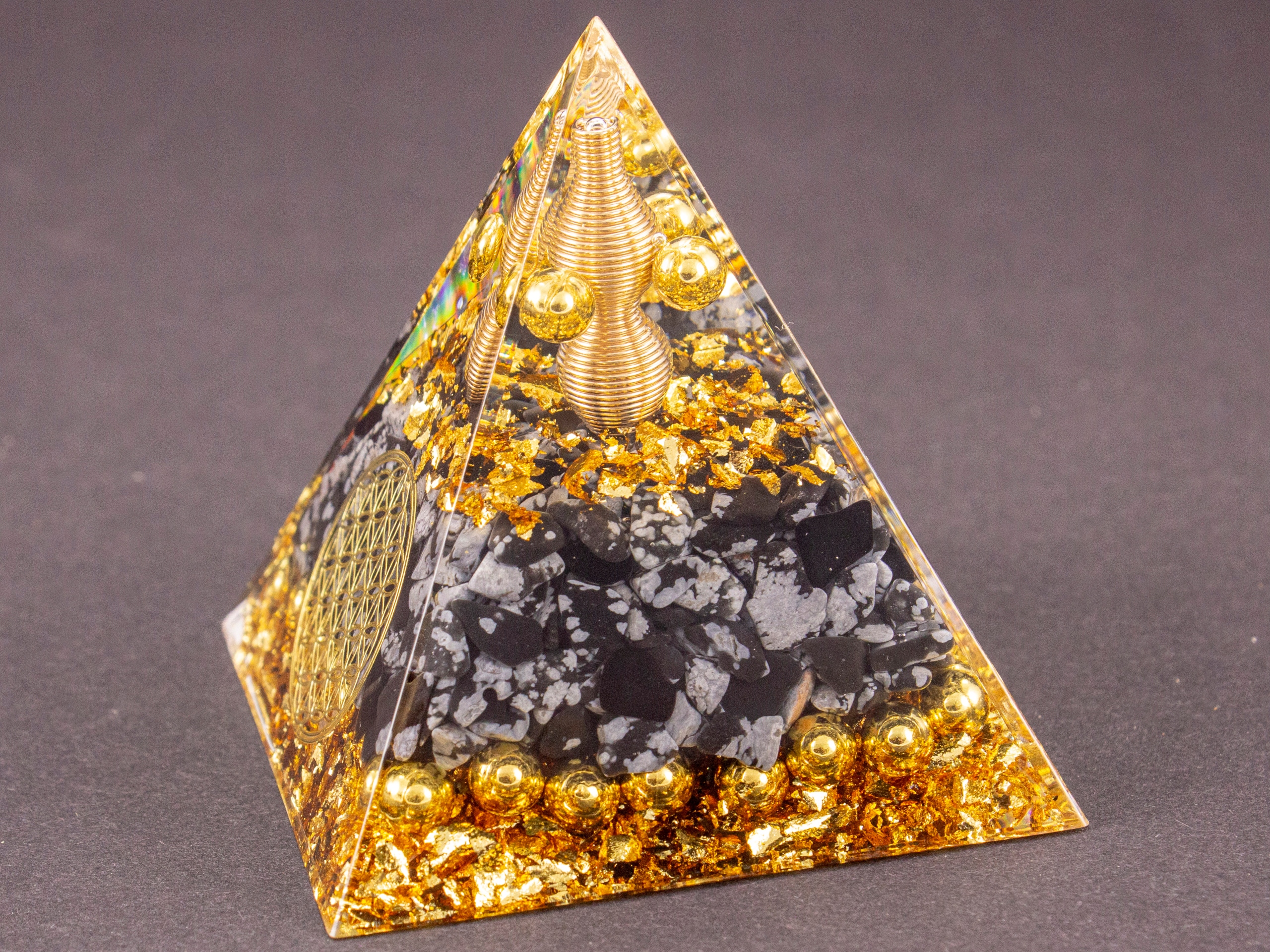 Відкрийте для себе магію оргонітової піраміди зі сніговим обсидіаном, Квіткою життя, золотою фольгою, перлами зі сплаву міді та золота, які чудово поєднують кольори з цілим!