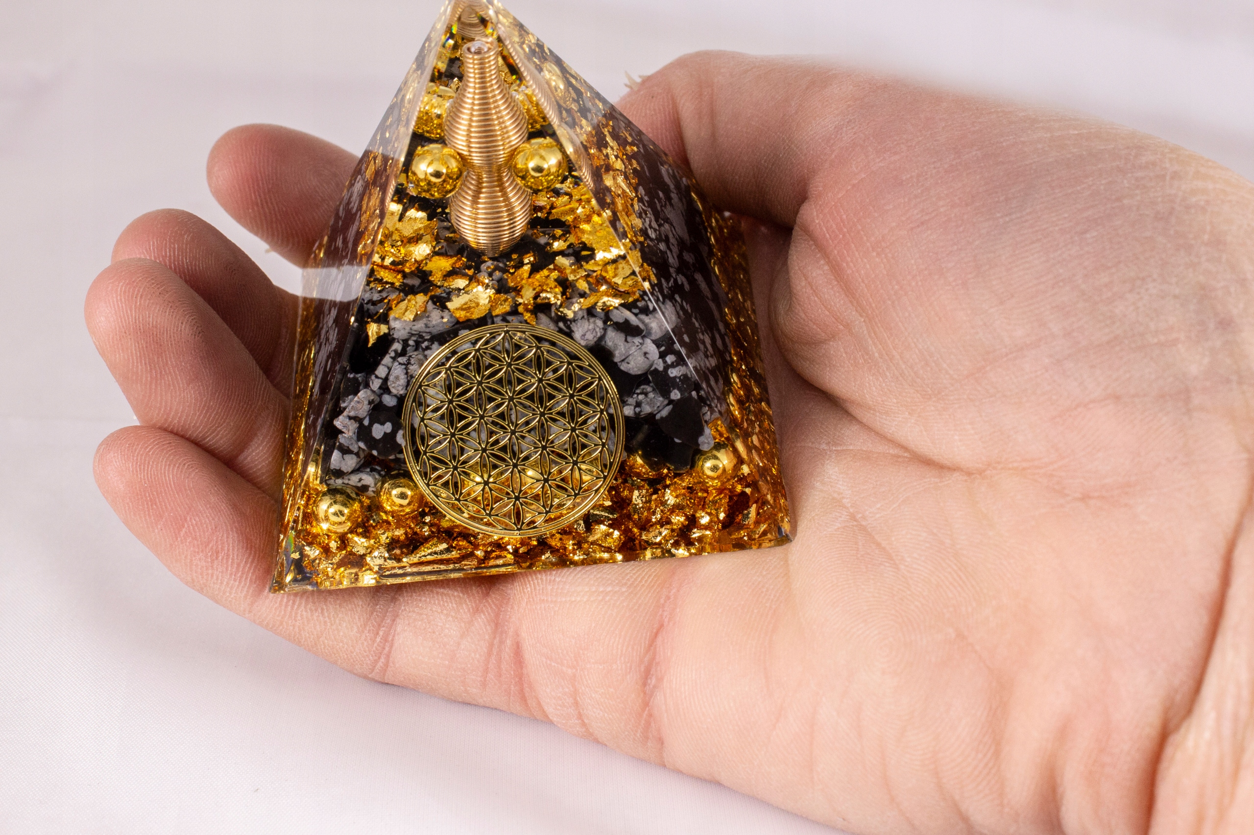 Оргонітова піраміда зі сніговим обсидіаном, Квіткою життя, золотою фольгою, міддю та перлами є ідеальним вибором для людей, які шукають: