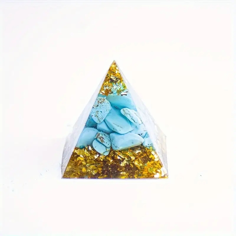 Прекрасна оргонітова піраміда - чудова бірюза, блискуча золота фольга, красива прикраса зі смоли з незвичайним, приємним для ока виглядом, випромінює енергію, яка дарує міцне здоров’я, нейтралізує погану енергію, додає душевний спокій і кращий настрій.