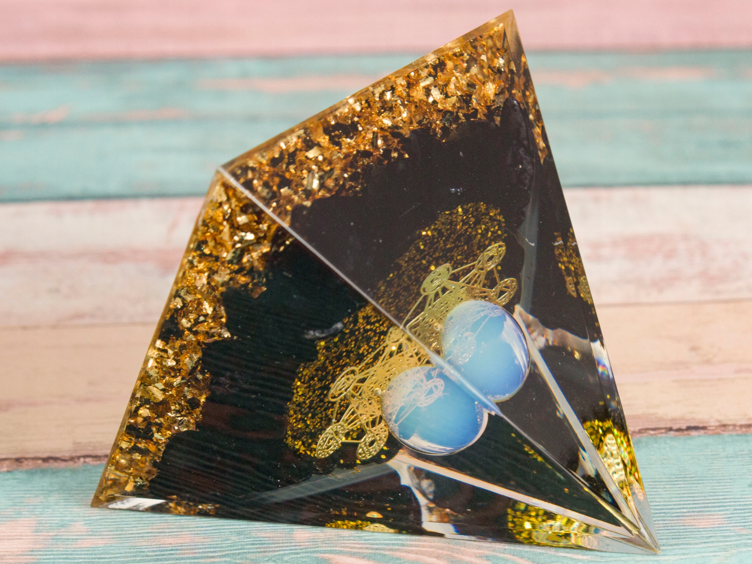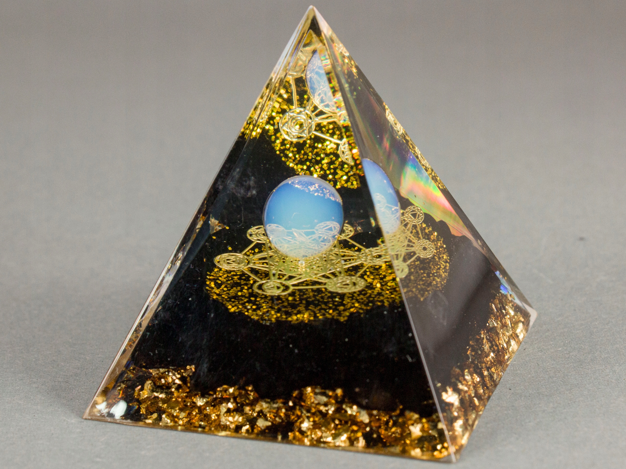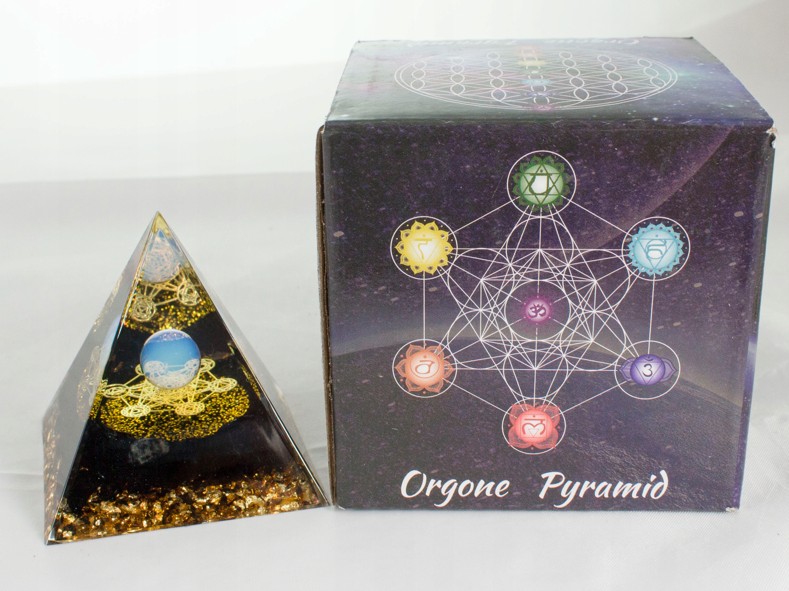 Прекрасна піраміда оргоніту, яка не тільки зачаровує її зовнішній вигляд та поєднання кольорів, але і з енергетичною активністю допомагає замовкнути розум, сприяє поглинанню знань, медитації, заспокоює емоційне напруження, вона забезпечує нікодуість і створює сильний сон і створює сильний сон і створює сильний сон і створює сильний сон і захис. - Білий агат