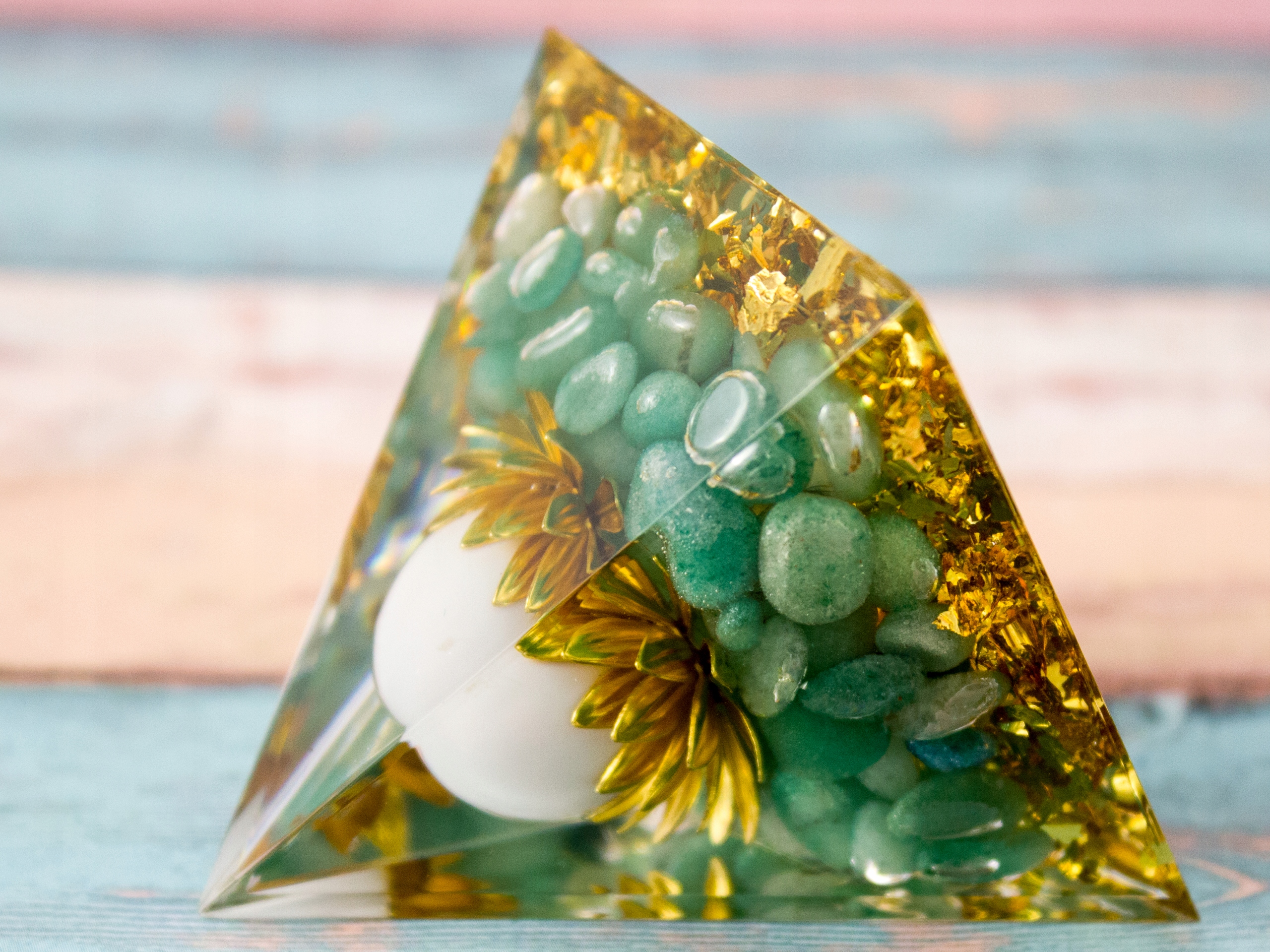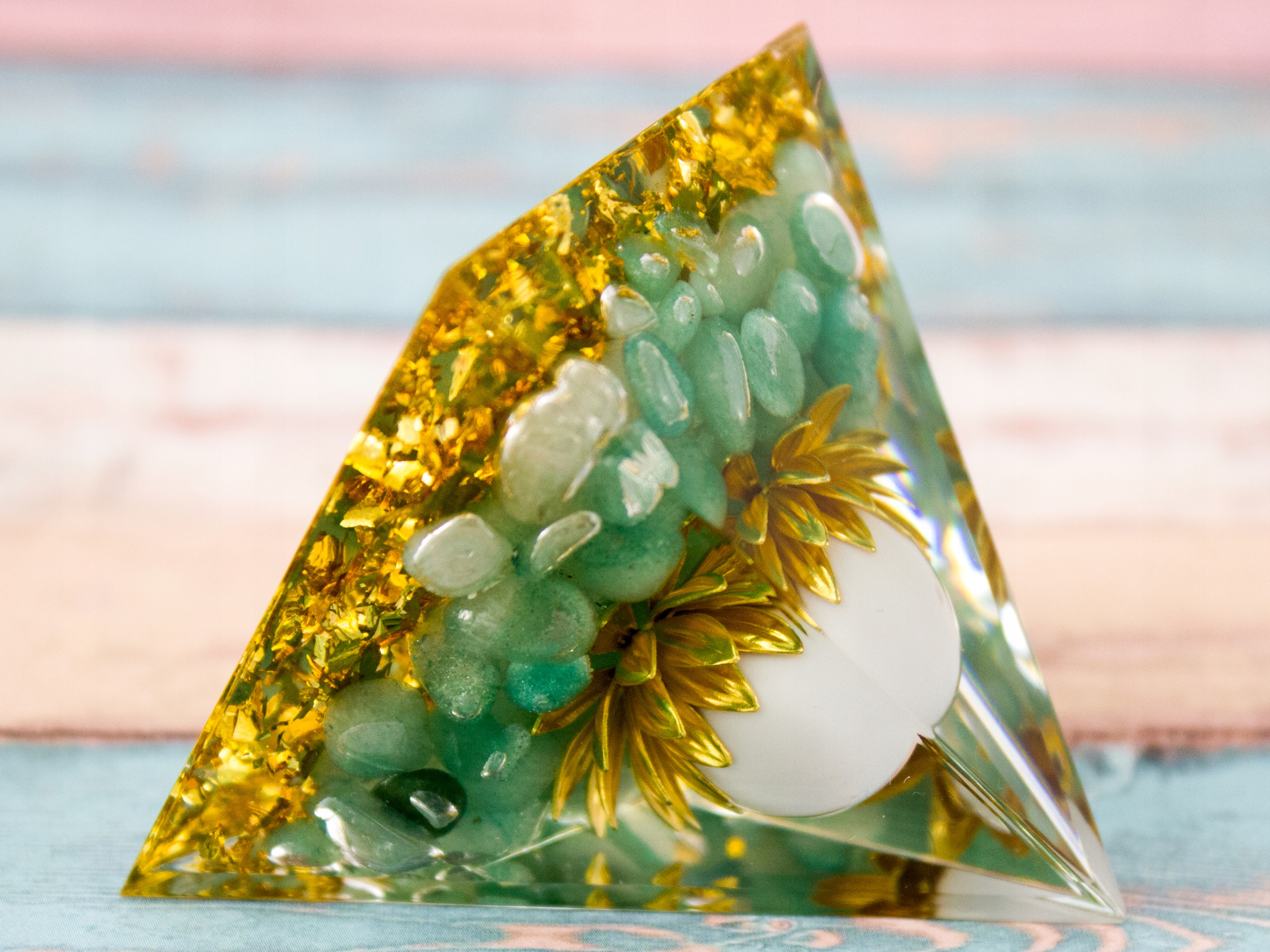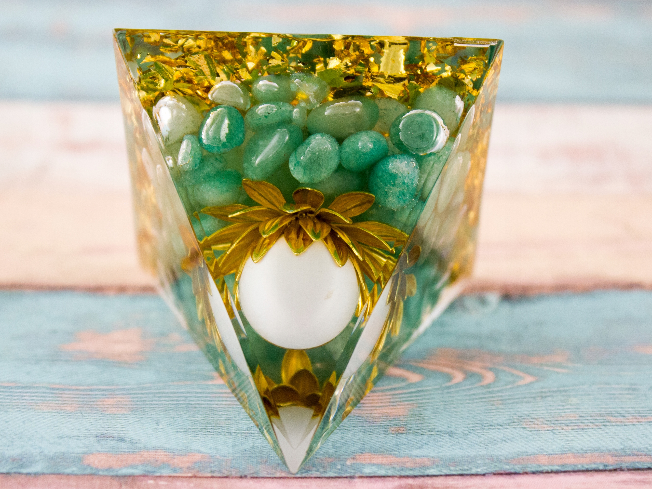 ОРГОНІТОВА ПІРАМІДА ЖАДЕЇТ ЗЕЛЕНА КВІТКА ЛОТОСА БІЛИЙ АГАТ ЗОЛОТА ФОЛЬГА 5см