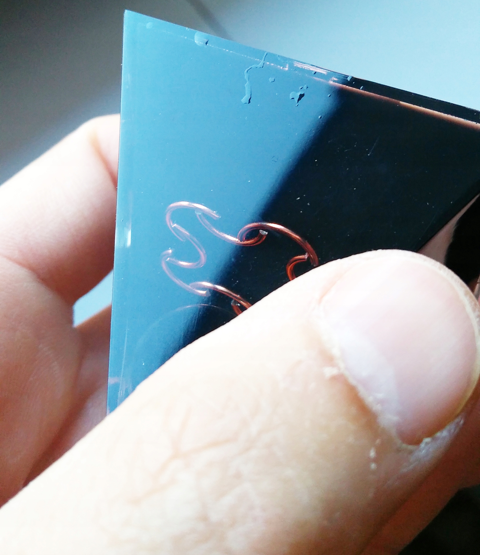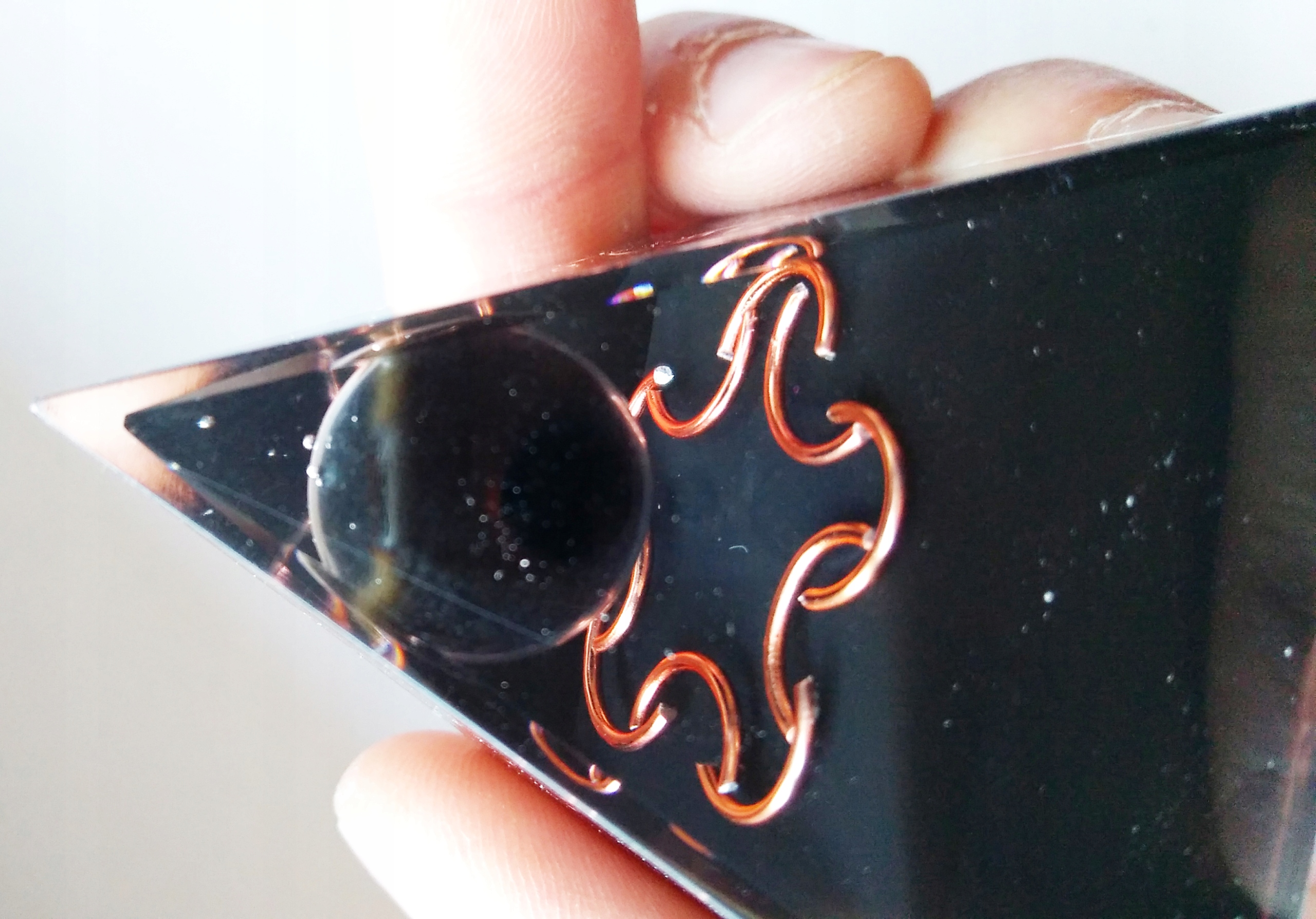 На цій темній основі навколо неї розташовано коло з товстого мідного дроту, створюючи чарівний візерунок красивого золотистого кольору. Мідь, відома своїми провідними властивостями, посилює потік енергії в піраміді, посилюючи її дію.