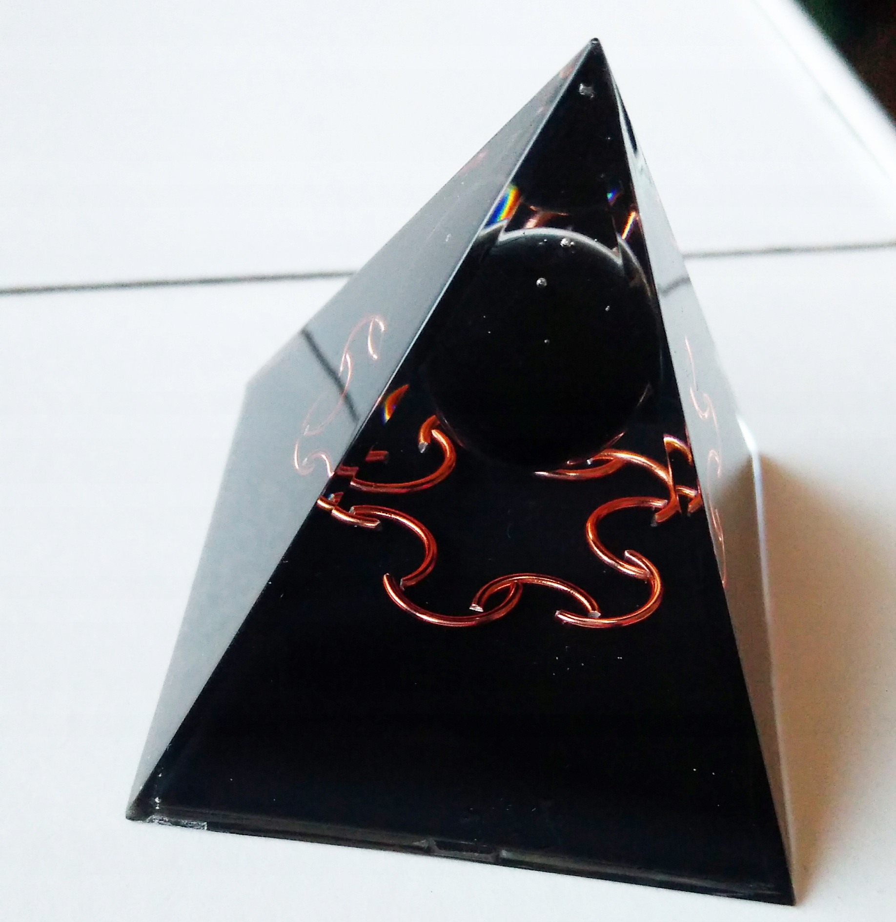 У піраміді вплетений у неї мідний дріт діє як антена, яка посилює та спрямовує потік енергії породжені оргонітом і елементами, що містяться в ньому камені. Саме мідь підсилює вібрації обсидіану та турмаліну, роблячи їх дію більш ефективною.