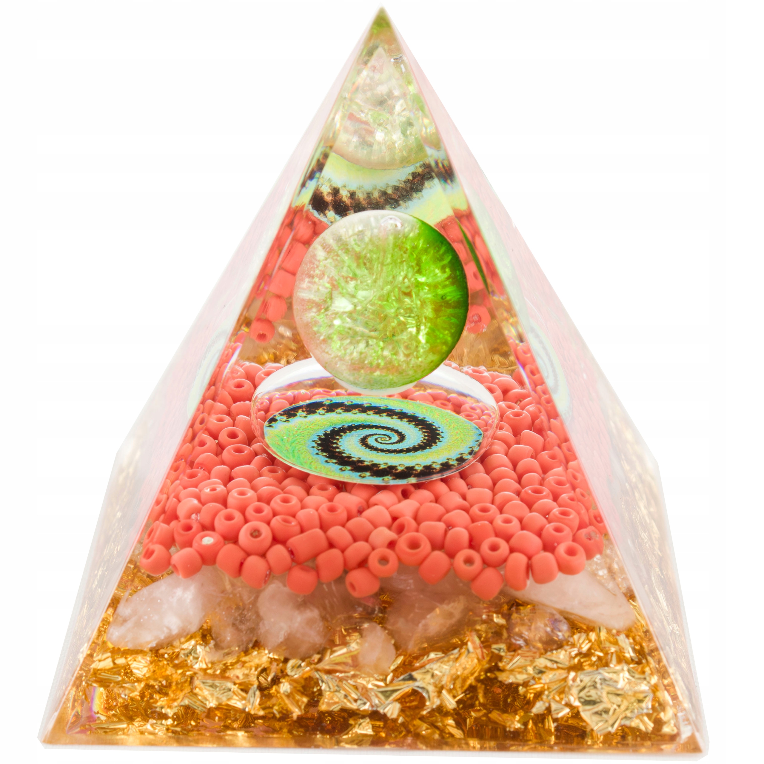 Радіус світла та гармонії для вашого простору: унікальна оргонітна піраміда, створена з блискучої золотистої фольги, делікатної рожевої кристала та енергійної намистини з динамічною спіральною щоденною дозою позитивної вібрації. 4 На перший погляд, його динамічний склад привертає увагу, створений для гармонії та позитивної енергії. Над золотом є делікатна, заспокійлива енергія рожевий кристал , що символізує любов, мир та емоційне зцілення. Наступний шар інтенсивно помаранчеві, маленькі намистини , що вводять у композицію вібрацію радості, ентузіазму та творчості, додаючи унікальну текстуру піраміді. Потік енергії, розвиток та динаміка життя. над щитом , вбудованим у смолу, сяючи прозору кулю зеленуватою відтінком , який додає глибину та загадковості піраміді, прекрасно відволікаючих світла.