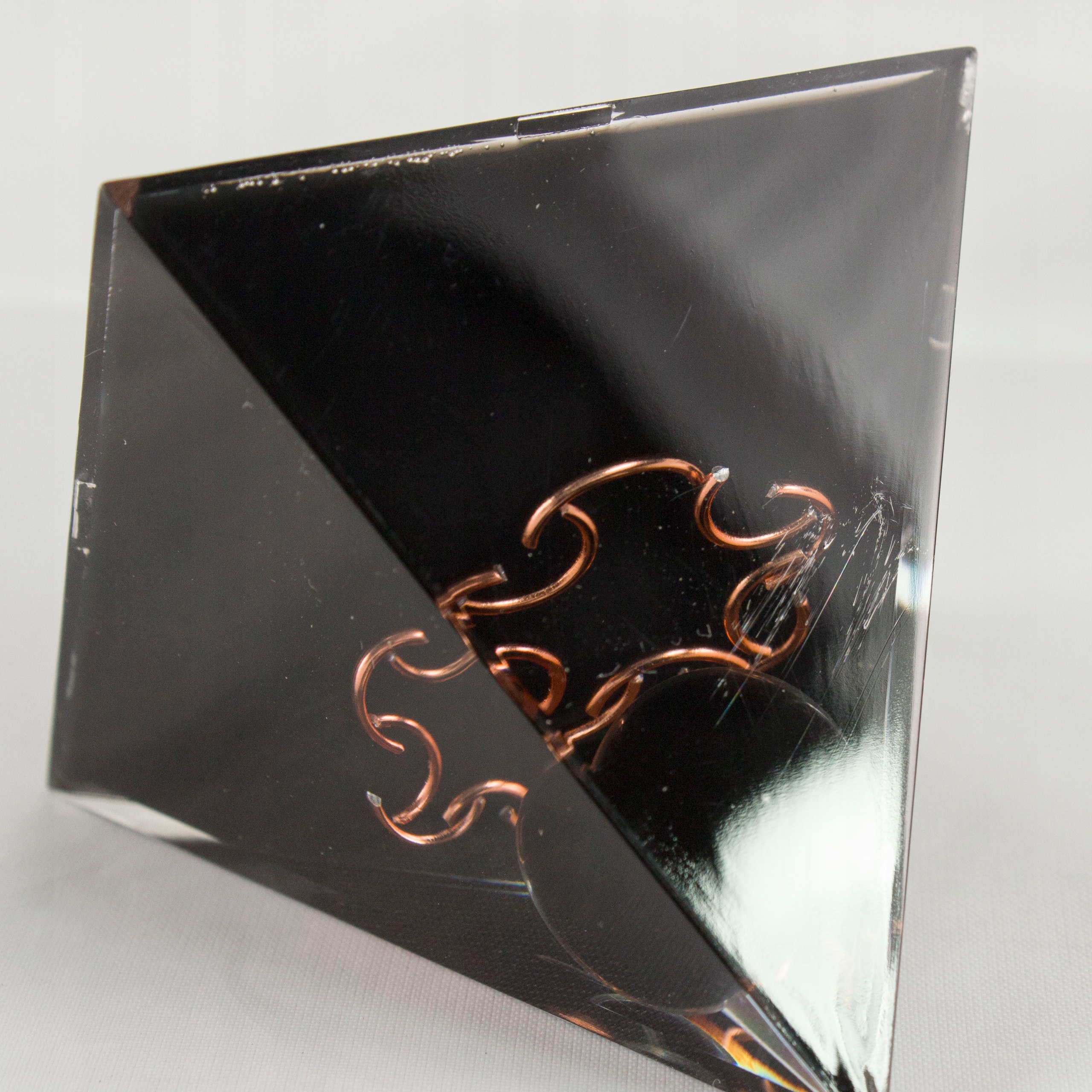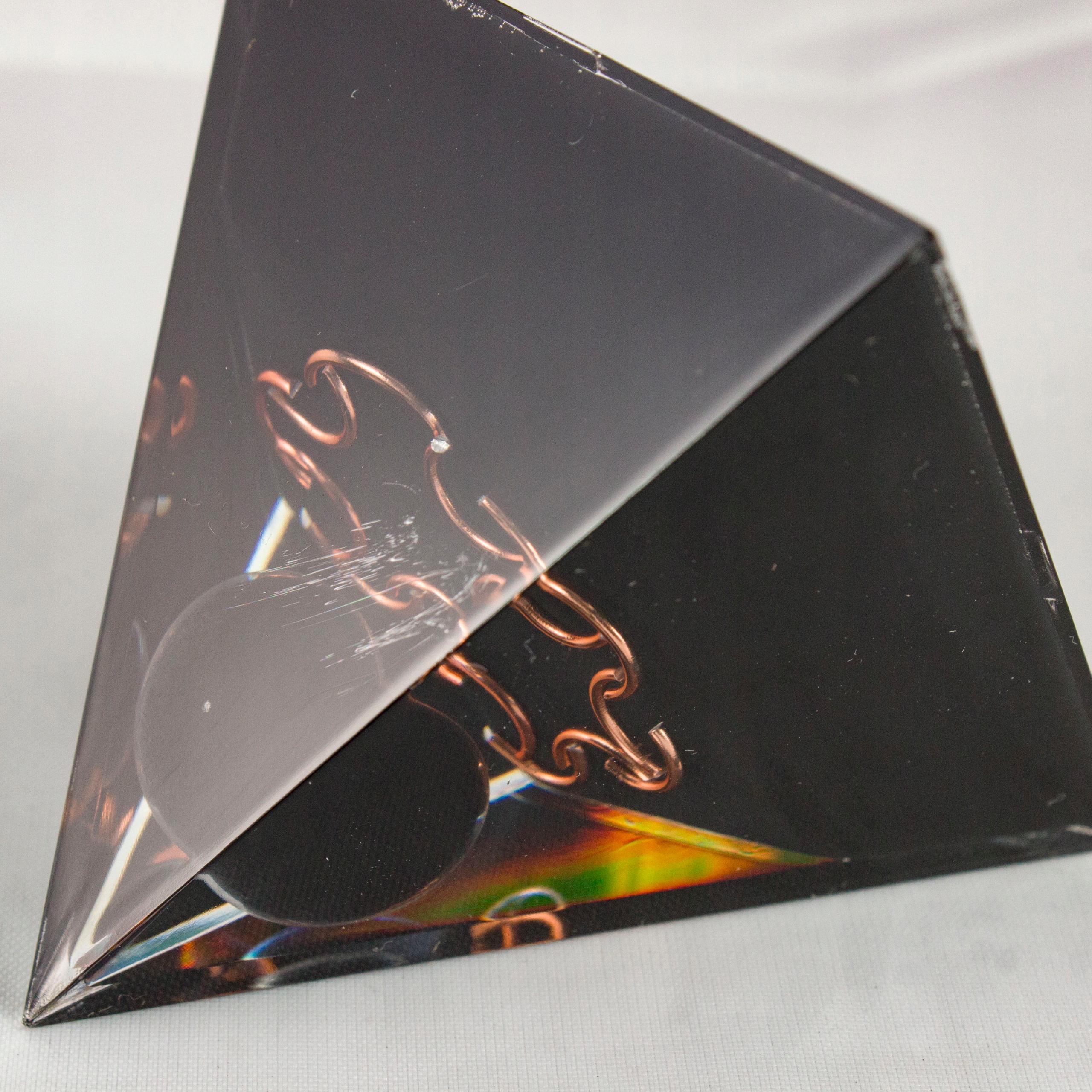 На цій темній основі навколо коло, виготовлене з густого мідного дроту , створюючи гіпнотизуючий малюнок з прекрасним золотим кольором . Мідь, відома своїми провідними властивостями, зміцнює потік енергії по всій піраміді, посилюючи її дію.